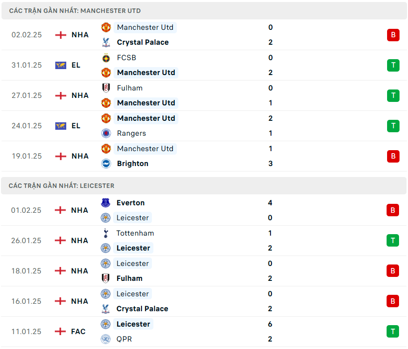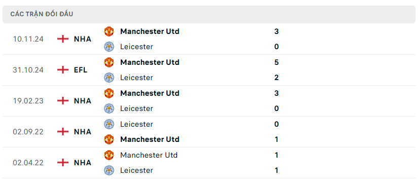 Lịch sử đối đầu, phong độ MU vs Leicester City