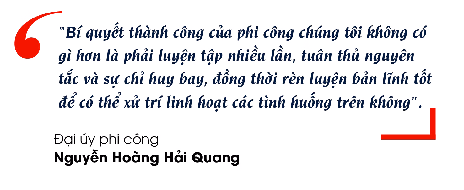 “Với phi công quân sự, để bay được và thực hiện nhiệm vụ thì phải huấn luyện, luyện tập suốt cả quá trình công tác, không được để giãn cách. Ở mỗi bài bay, sau khi huấn luyện xong chỉ có giá trị trong một thời gian nhất định. Chính vì thế, để đảm bảo kỹ thuật lái liên tục, chống giãn cách và nâng cao kỹ thuật lái cho phi công, đơn vị phải tổ chức huấn luyện thường xuyên với nhiều bài bay”, Đại úy Quang chia sẻ.