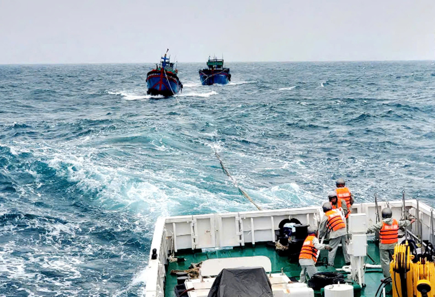 | Tàu 368, Vùng 3 Hải quân lai kéo Tàu cá ĐNa 91095 TS và ĐNa 91282TS về bờ. Ảnh: Hoàng Diệu |