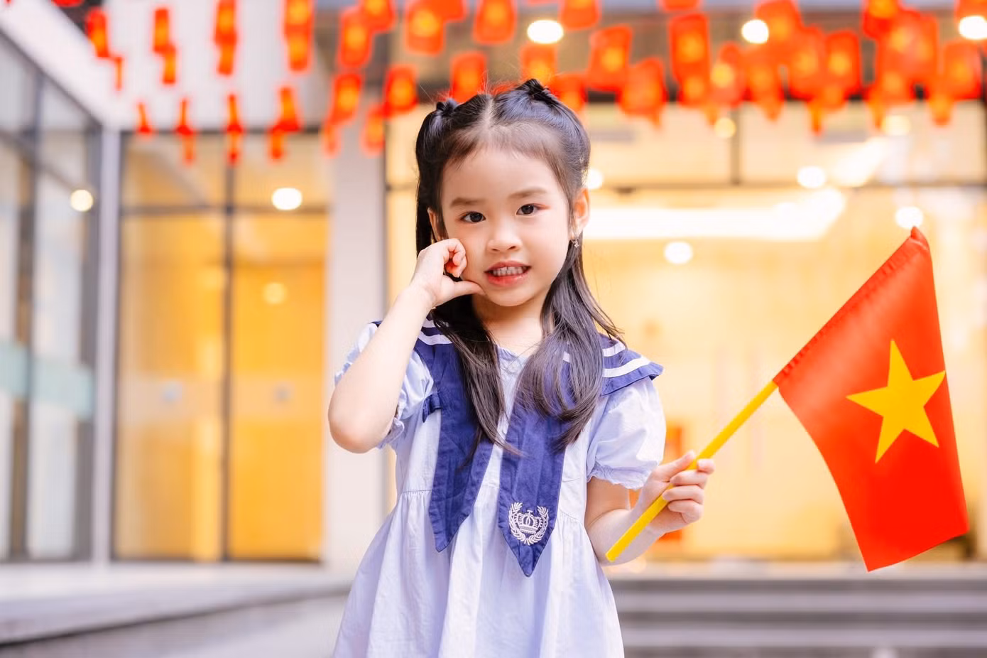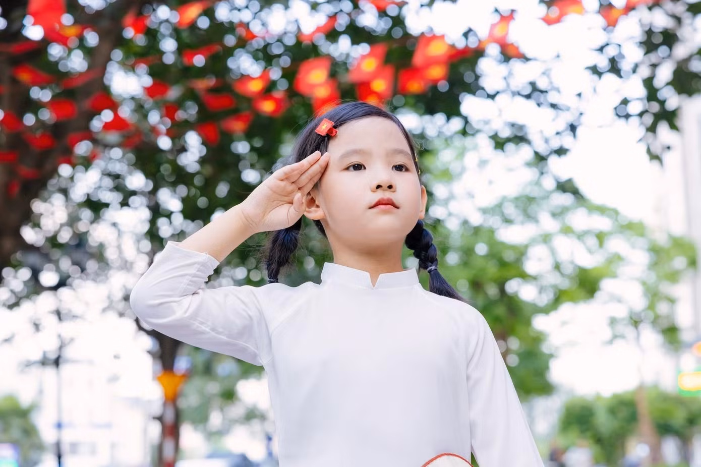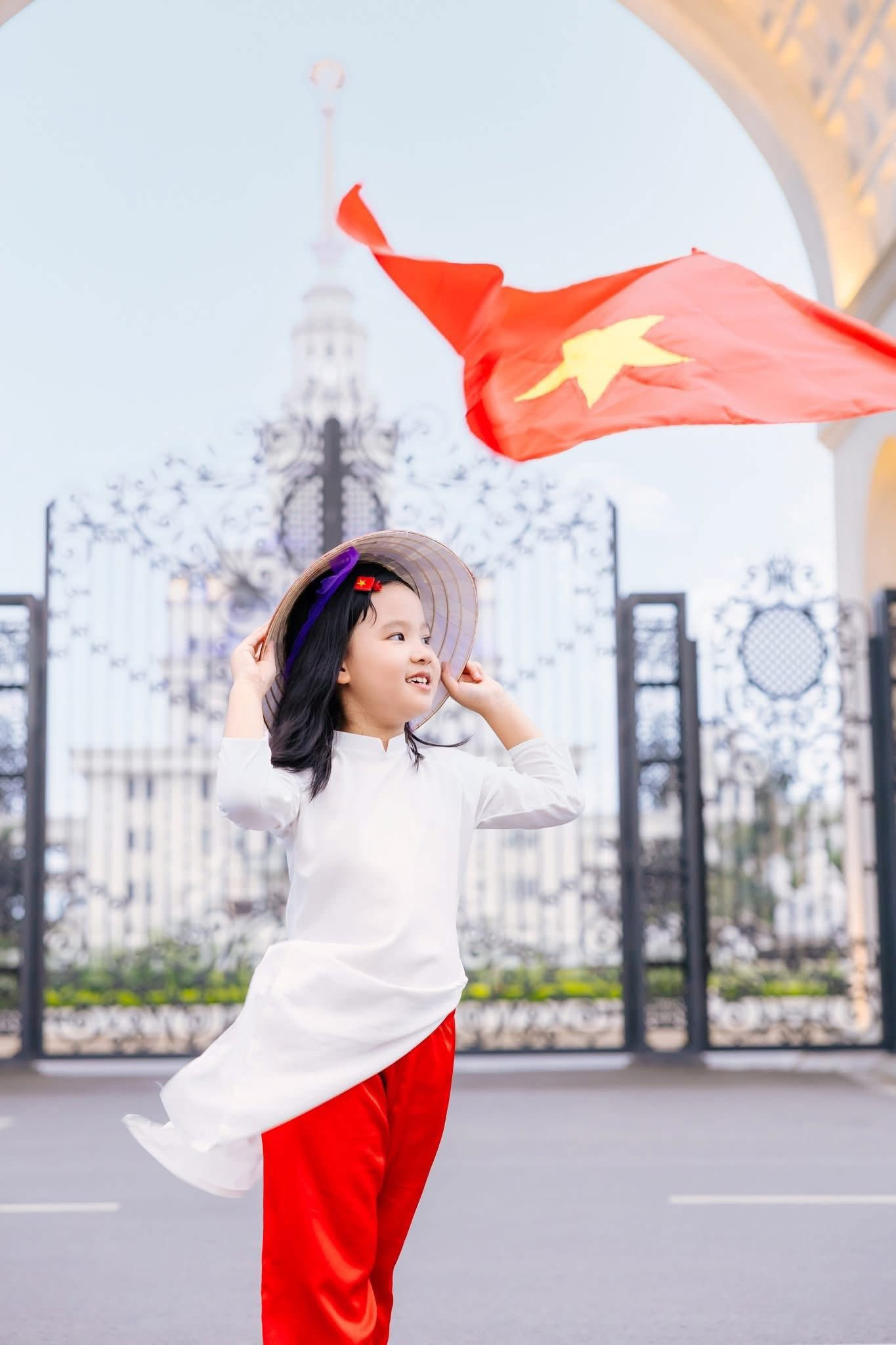 | Học viên Học viện Cảnh sát Nhân dân chụp ảnh với sắc đỏ của cờ Tổ quốc và cờ Đảng. Ảnh: Ly Ly |