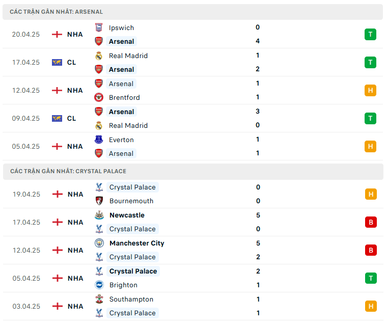 Lịch sử đối đầu, phong độ Arsenal vs Crystal Palace
