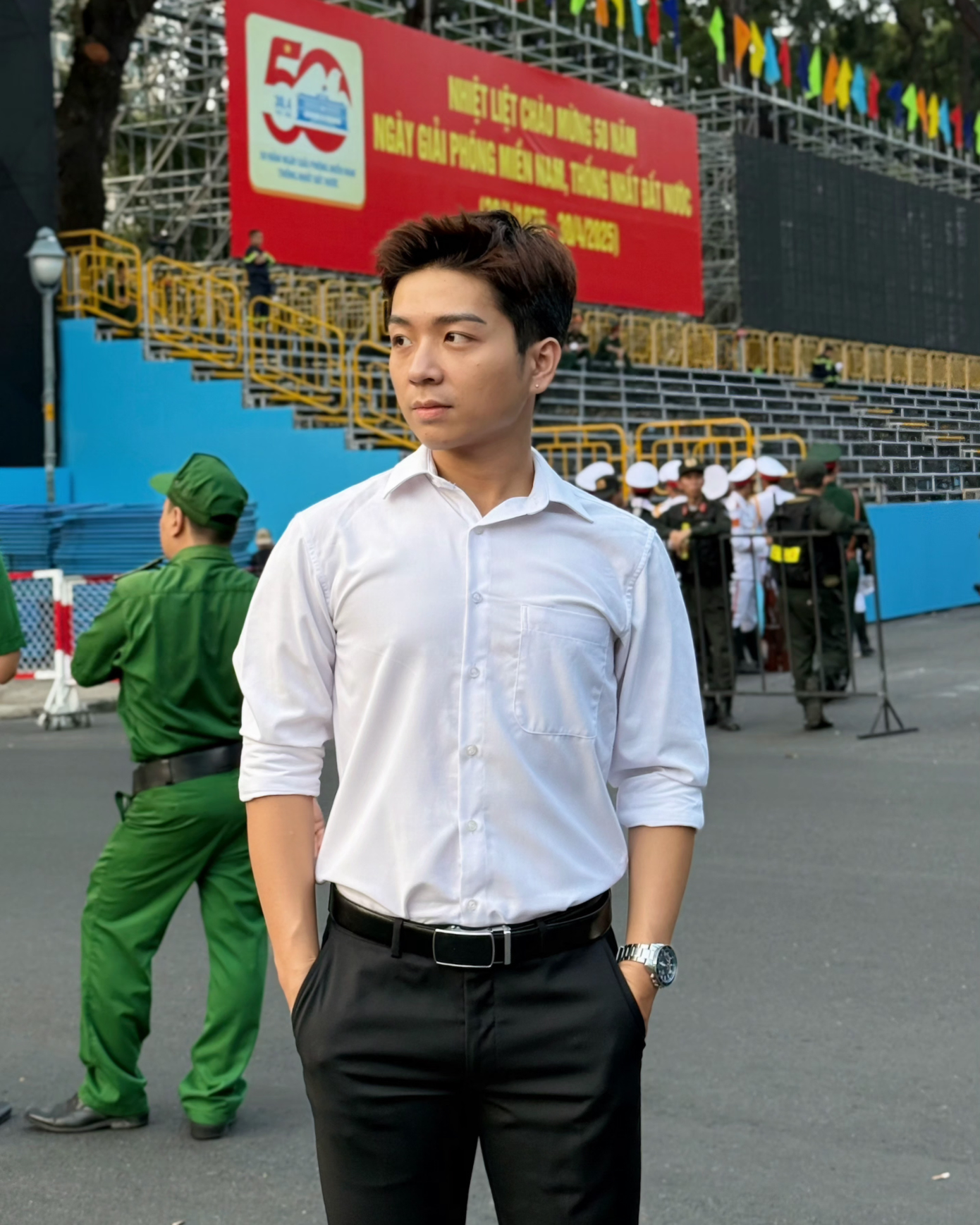 Với thầy giáo dạy Hóa trẻ Lê Phạm Hữu Tâm, không khí của đại lễ lần này gợi nên sự xúc động mãnh liệt: "Mỗi lần nghe nhạc cách mạng vang lên cùng đoàn diễu binh, diễu hành mình lại rưng rưng". Đối với thầy Tâm, đại lễ 30/4 không chỉ là dịp kỷ niệm ngày non sông liền một dải, mà còn là bản hòa ca của lòng biết ơn, của sự tôn vinh những hy sinh của cha ông để bảo vệ nền độc lập, hòa bình hôm nay.