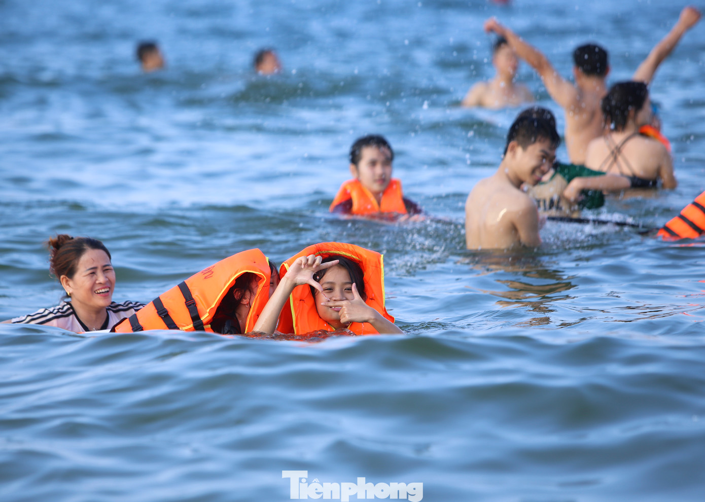 Với nền nhiệt dao động từ 33-35 độ C, rất đông người dân đi du lịch đều lựa chọn các bãi tắm để “giải nhiệt”. Các em nhỏ khi tắm biển đều có sự giám sát của người lớn.