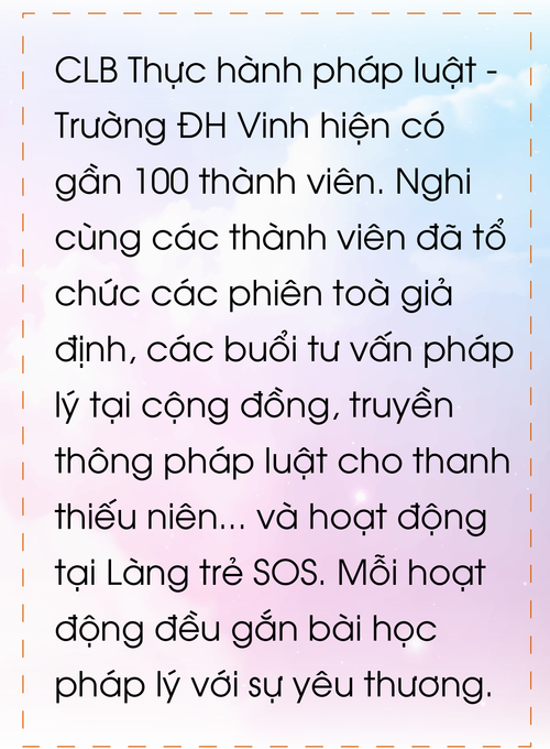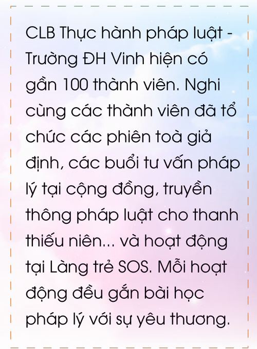 Đặc biệt, những nội dung, đề xuất của đề tài đã được Phương Nghi triển khai trong hoạt động, sinh hoạt của câu lạc bộ Thực hành pháp luật của trường, mà cô đang làm chủ nhiệm.