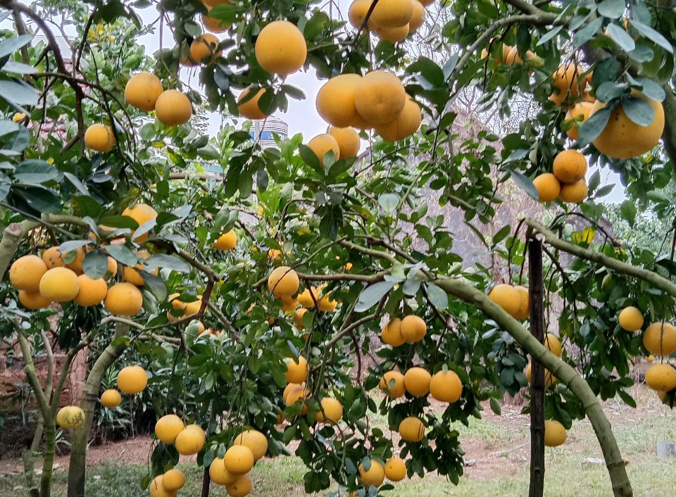 | Vườn bưởi Diễn vàng óng của người dân thôn Đại Đồng. |