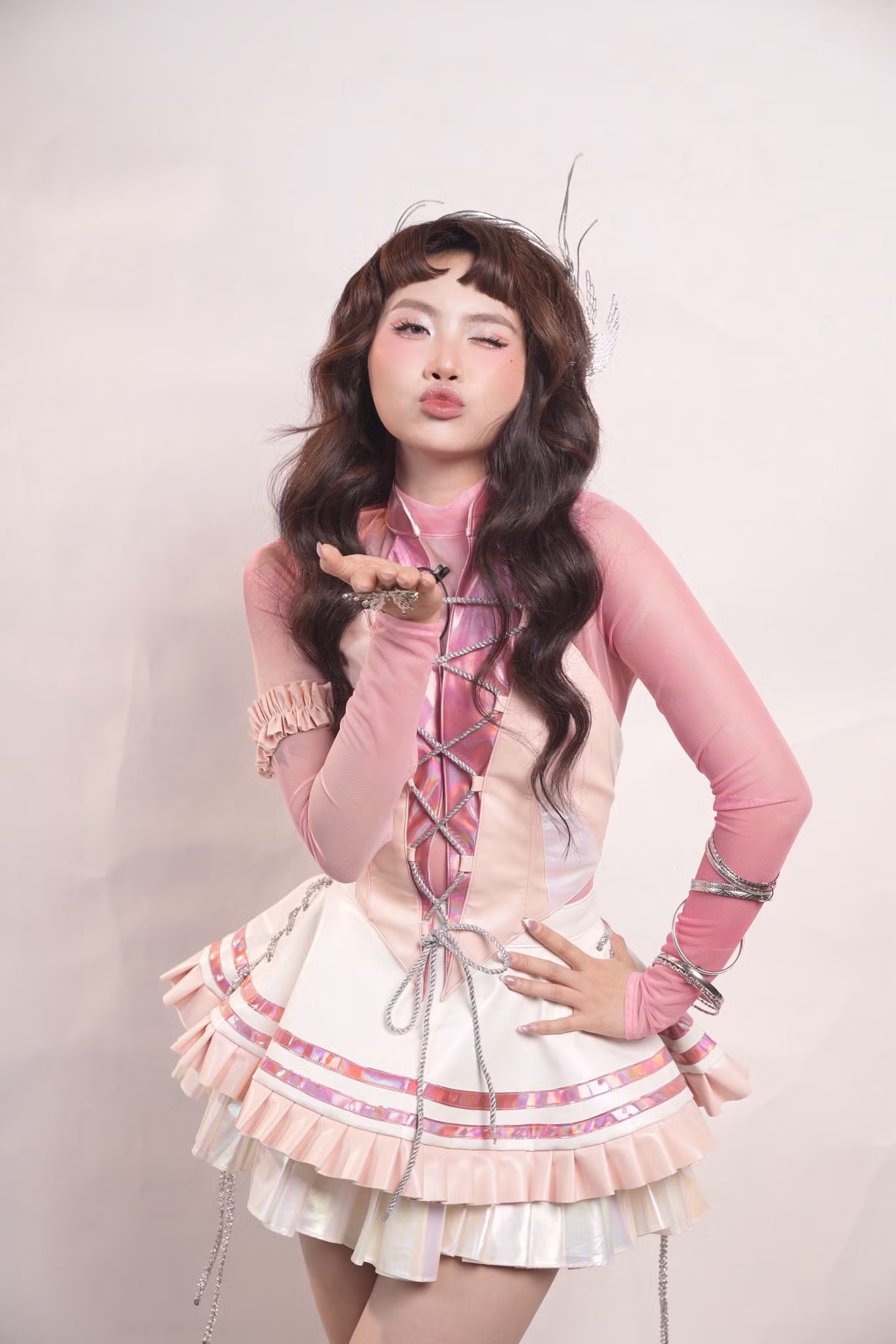 Liu Grace đã có dấu ấn thời trang nhất định từ Rap Việt 2023, tiếp tục phát triển phong cách cá nhân mạnh mẽ tại Em Xinh "Say Hi". Trang phục của "vành khuyên nhỏ" nổi bật nhờ hệ thống đính kết dày đặc, mang đậm tinh thần Y2K.