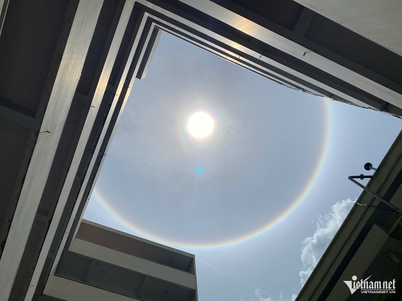 Theo đó, người dân sinh sống tại các quận 1, 3, 4, 5, 8, Bình Thạnh... bất ngờ khi thấy một vòng tròn lớn với đủ sắc màu cầu vồng bao quanh mặt trời chói chang.