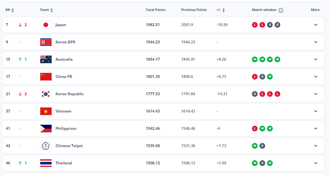 Trên bình diện khu vực, thầy trò HLV Mai Đức Chung tiếp tục giữ vị trí số 1 Đông Nam Á, trên các đối thủ như Thái Lan, Philippines và Myanmar.