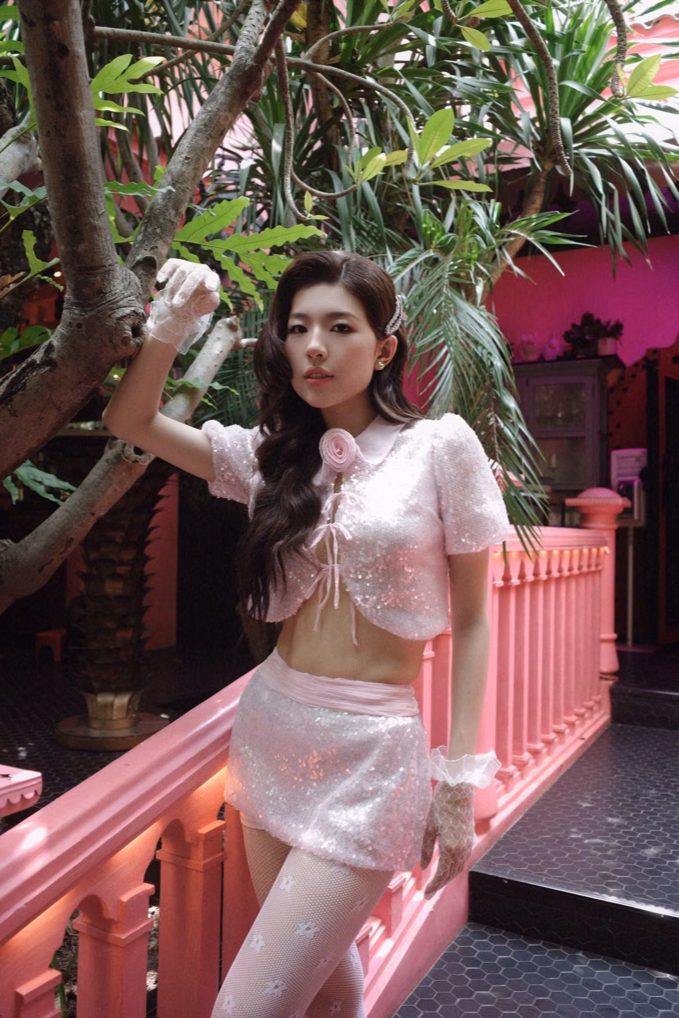 Lamoon Diễm Hằng lựa chọn set trang phục chất liệu sequin, tạo điểm nhấn với găng tay, quần tất ren. Nhan sắc của mỹ nữ Gen Z khiến cư dân Threads city xuýt xoa, được ví như "bạch nguyệt quang".