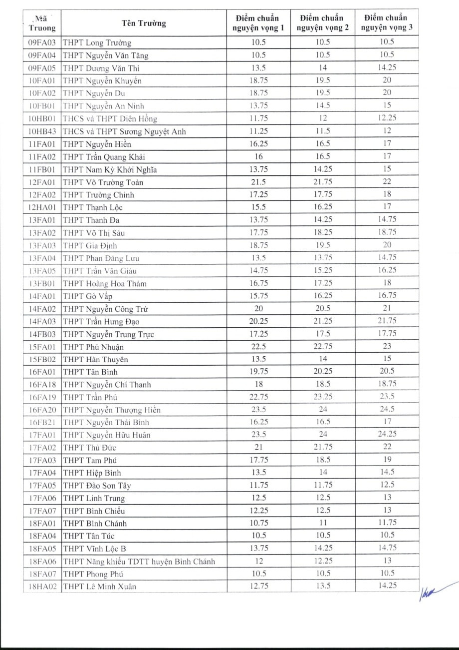 Một số trường THPT như THPT Cần Thạnh, THPT An Nghĩa, THPT Bình Chánh (huyện Cần Giờ); THPT Long Trường, THPT Nguyễn Văn Tăng (TP. Thủ Đức); THPT Đa Phước, THPT Phong Phú, THPT Tân Túc (huyện Bình Chánh); THPT Ngô Gia Tự (Quận 8) và THPT An Nhơn Tây (huyện Củ Chi) có mức điểm bằng nhau cho tất cả các nguyện vọng là 10,5 điểm.