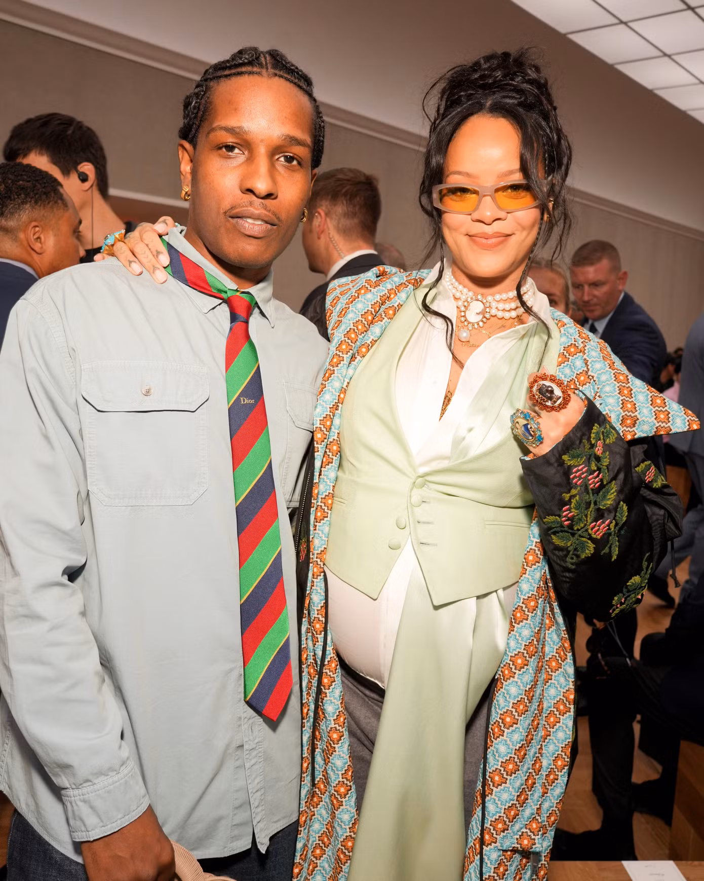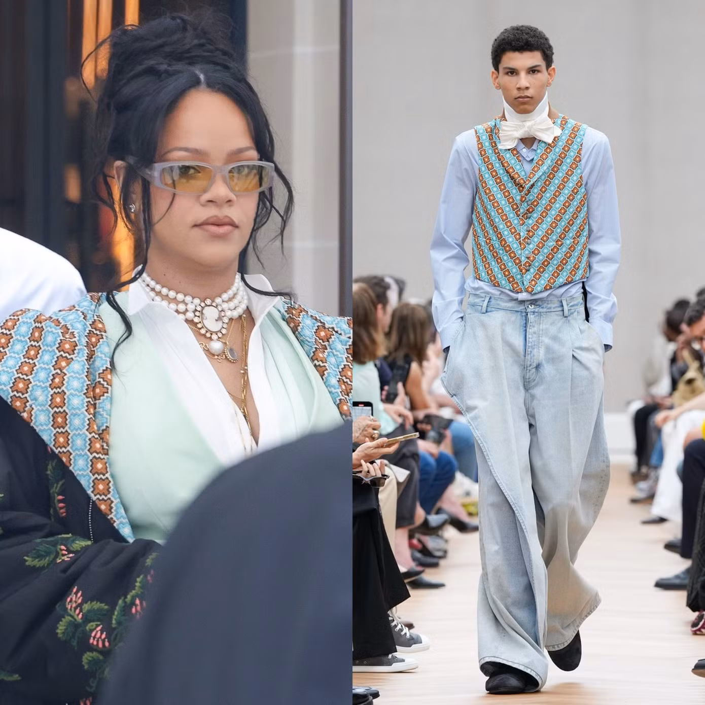 Khác với dàn khách mời ưu tiên những thiết kế đơn giản, năng động, mẹ bầu Rihanna lăng xê phong cách maximalism/ cường điệu hóa. Trang phục của nữ tỷ phú được tùy chỉnh từ vải họa tiết của BST Men’s Summer 26.