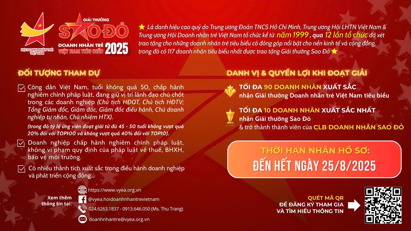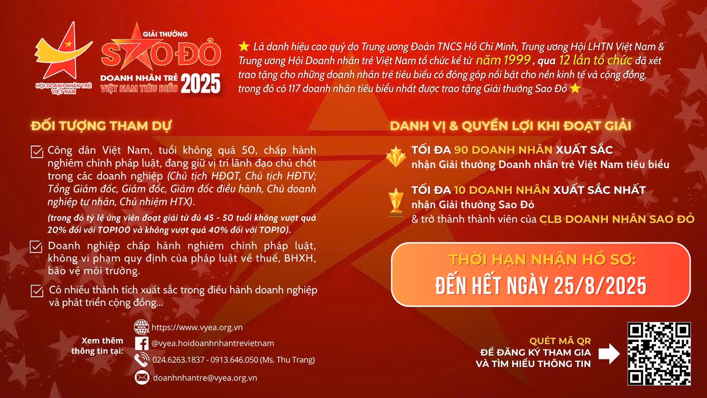 Theo Ban Tổ chức, Giải thưởng Sao Đỏ năm 2025 có đối tượng tham gia giải thưởng là công dân Việt Nam, tuổi không quá 50 (trong đó, tỷ lệ ứng viên đoạt giải từ đủ 45 - 50 tuổi không vượt quá 20% đối với TOP100 và không vượt quá 40% đối với TOP10), chấp hành nghiêm quy định của pháp luật.