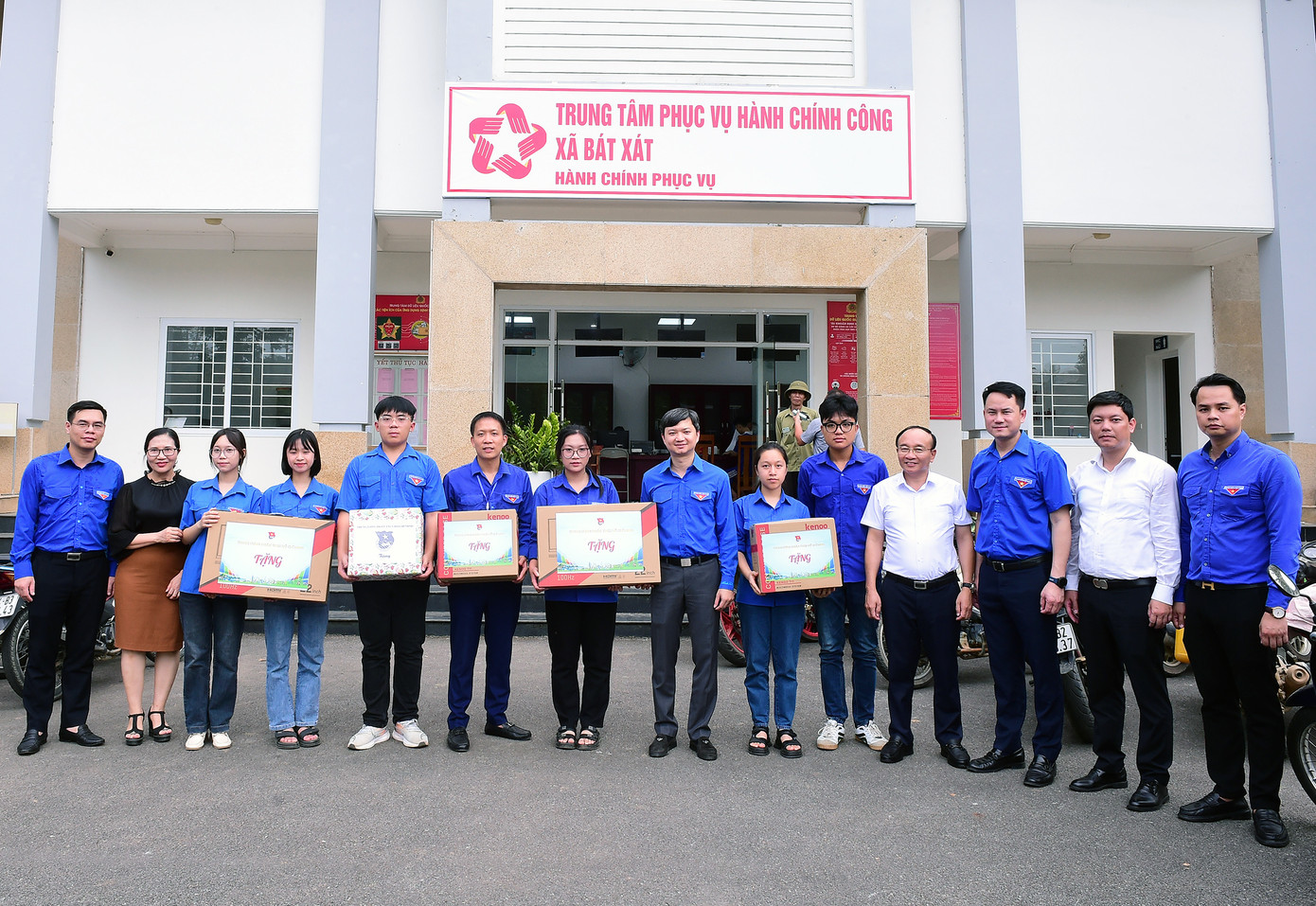 | Bí thư T.Ư Đoàn Nguyễn Minh Triết tặng đội hình thanh niên tình nguyện hỗ trợ chính quyền và nhân dân vận hành mô hình chính quyền địa phương 2 cấp. Ảnh: Xuân Tùng |