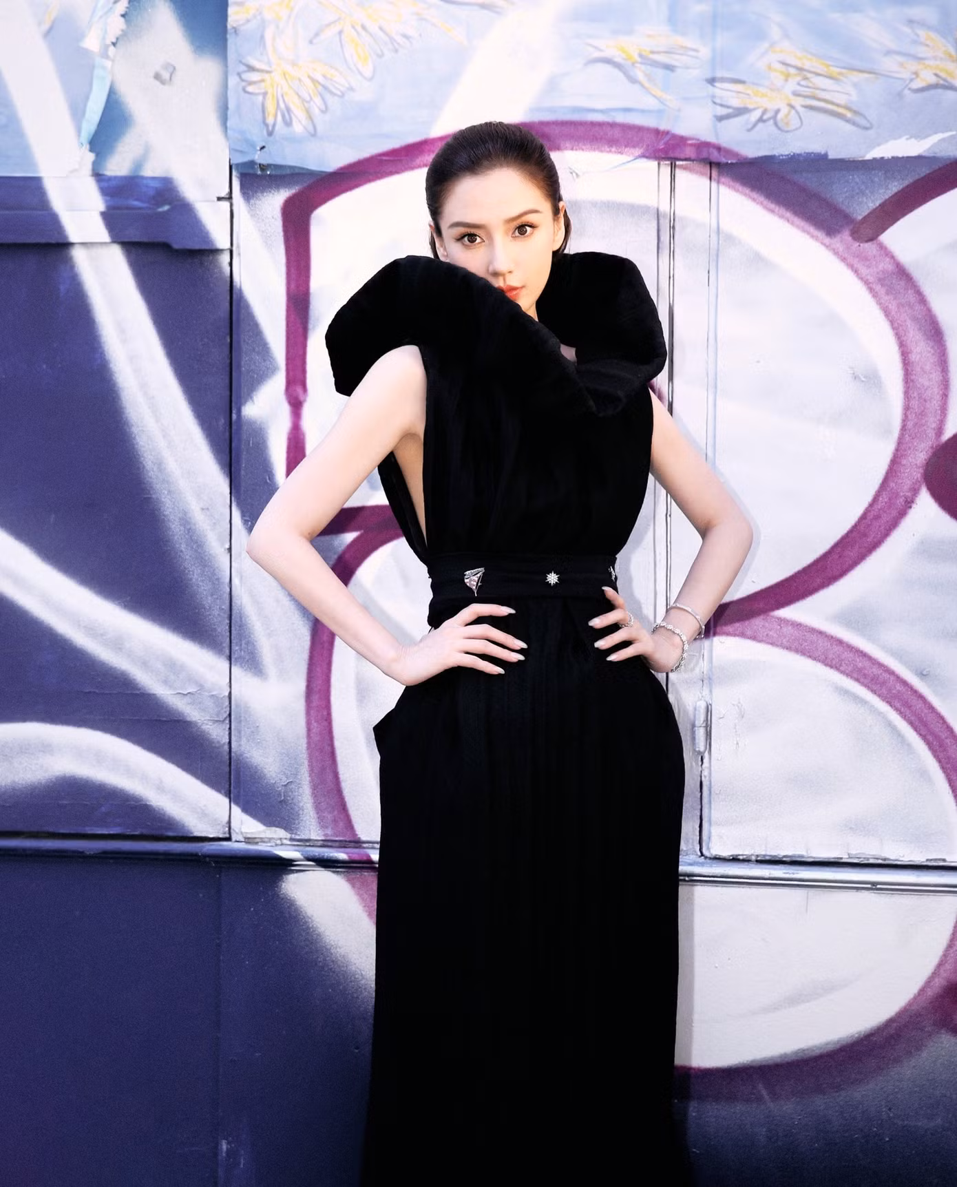 Ở buổi trình diễn của thương hiệu Robert Wun, Angelababy tái hiện vẻ đẹp phong cách Hồng Kông gây trầm trồ. Mỹ nhân Hoa ngữ diện thiết kế Haute Couture Xuân Hè 2024 nằm trong BST kỷ niệm 10 năm thành lập của thương hiệu, ra mắt tháng 9 năm ngoái. Để hoàn thiện tạo hình sắc sảo, mạnh mẽ, cô kết hợp cùng đôi giày cao gót 15cm, phụ kiện Mikimoto x Chrome Hearts.