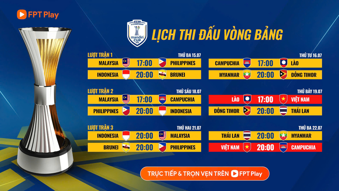 Thầy trò HLV Kim Sang-sik sẽ gặp U23 Lào trận ra quân ngày 19/7 trước khi thi đấu trận 2 trước U23 Campuchia ngày 22/7. Dưới đây là lịch thi đấu của giải đấu: