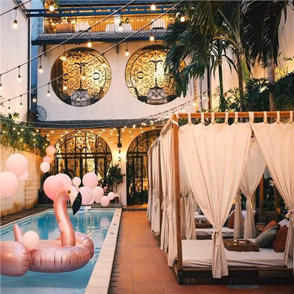 Mới đây, những hình ảnh chụp không gian một quán café ở Sài Gòn có phong cách resort châu Âu được dân tình chia sẻ rầm rộ. Ngoài khu vực có ghế tựa và bàn gỗ, quán café đặc biệt gây tò mò khi đặt những chiếc giường có gối và rèm, hướng thẳng ra hồ bơi. Màu sắc trang nhã khiến view quán café càng trở nên lung linh hơn khi có ánh đèn chiếu vào.
