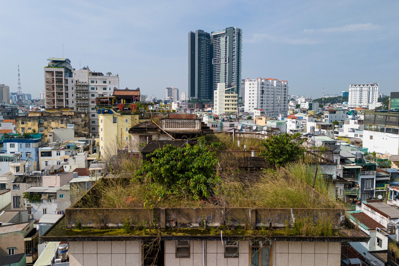 "Năm đầu sau khi di dời, nghe tin thành phố tìm nhà đầu tư, tôi mừng lắm, cứ nghĩ sắp được về nhà. Nhưng nhiều năm trôi qua, đâu vẫn vào đấy. Gần đây, tôi mới biết thành phố sẽ tiếp tục tìm nhà đầu tư, nhưng giờ không còn cảm xúc gì ngoài mong được trở về", bà Hảo chia sẻ và cho biết trước đây, khách ghé tiệm thường là người cùng chung cư, bây giờ có khách mới nhưng không ổn định. Được xây dựng trước năm 1975, chung cư Bùi Viện có quy mô gồm tầng trệt, 6 tầng lầu và sân thượng. Tòa nhà có kết cấu mái bê tông cốt thép, rộng gần 600 m2, với hơn 4.000 m2 sàn xây dựng. Phần lớn căn hộ ở đây có diện tích nhỏ, chủ yếu 16-40 m2, số ít căn lớn phía trước đường Bùi Viện rộng gần 60 m2. Trên tầng thượng, cỏ mọc um tùm. Nơi đây từng là sân chơi của trẻ em chung cư, nhiều gia đình còn tận dụng dây điện, dây cáp giăng trên sân thượng để làm dây phơi quần áo.