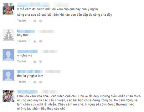 "Cháu đã xem khá nhiều các clip của chú. Chú vẽ rất đẹp. Nhưng điều khiến cháu thích những clip này là các câu chuyện, các bài học chứa đựng trong đó. Nó cảm động, và làm cháu suy nghĩ rất nhiều. Cháu cảm ơn chú, hi vọng sẽ sớm được thưởng thức những tác phẩm tiếp theo của chú", bạn Thuỷ Nguyên bình luận về clip.