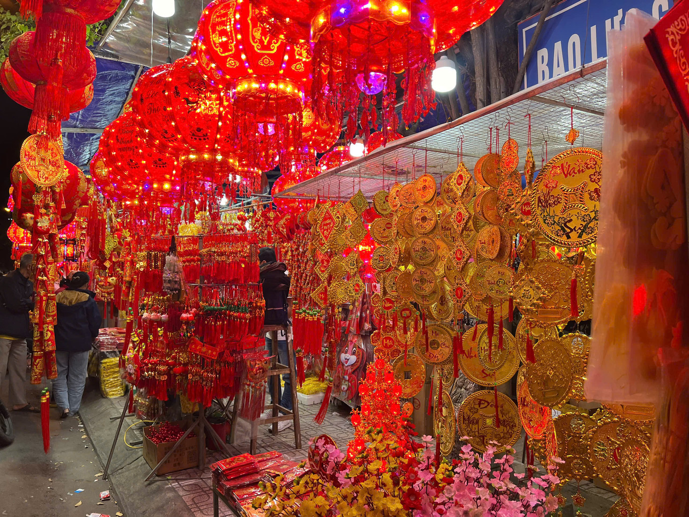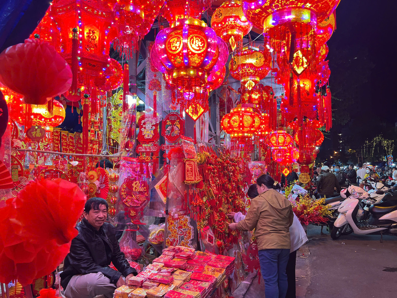 | Những người bán hàng treo thêm đèn lồng để gian hàng của mình thêm đa dạng giúp người dân có nhiều lựa chọn. |