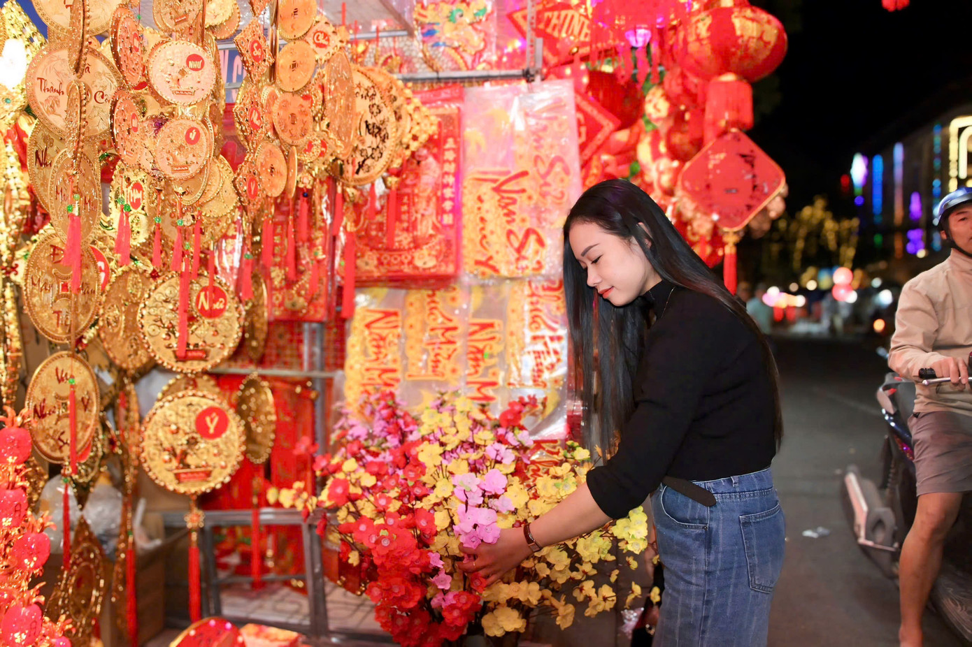 | "Phố đèn lồng" có gần 10 hộ kinh doanh, ngoài những chiếc đèn lồng với nhiều kích cỡ, các chủ sạp còn bán thêm những cành hoa đào, hoa mai (hoa giả), bao lì xì hay các đồ trang trí nhà cửa dịp Tết. |