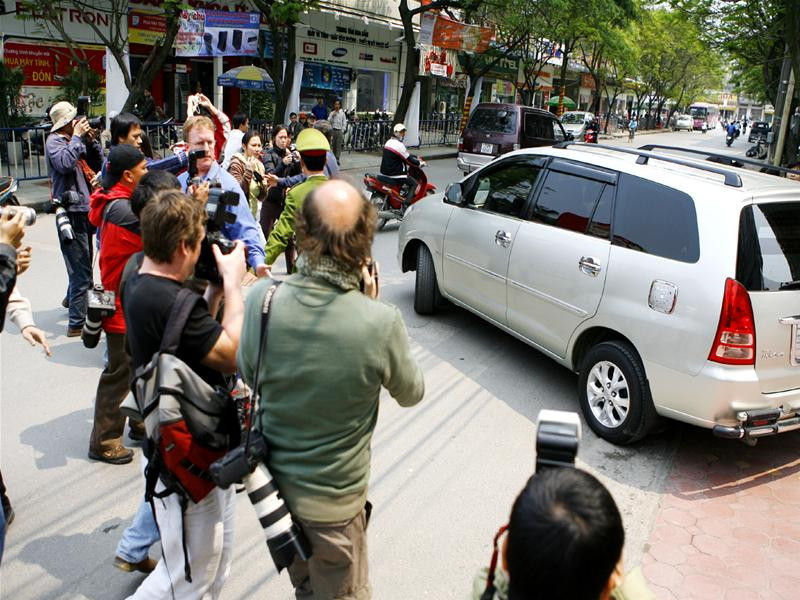 Chiếc Innova màu bạc chạy trên đường Ngọc Khánh, được phỏng đoán là có Angelina Jolie bên trong. Tuy nhiên, bằng mọi cách, các tay máy cũng không thể tiếp cận được gần hơn...