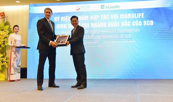 Cũng trong chương trình ngày 20/09, SCB đã tổ chức Lễ kỷ niệm hợp tác 3 năm giữa SCB và Manulife. SCB là đối tác độc quyền đầu tiên của Manulife trong việc phân phối sản phẩm bảo hiểm nhân thọ qua kênh ngân hàng (bancassurance) tại thị trường Việt Nam. Sau 3 năm hợp tác (từ tháng 9/2015 đến nay), SCB và Manulife đã đạt được những chỉ số tăng trưởng ấn tượng. Tỉ lệ doanh thu phí bảo hiểm (APE) bình quân đạt hơn 100% so với kế hoạch đề ra. Năm 2018, tiếp tục ghi dấu thành công vượt trội của hai bên khi tính đến Quý II/2018, chỉ tiêu kinh doanh đã vượt mức đề ra của cả năm. SCB đang là một trong những Ngân hàng cổ phần có tốc độ phát triển mảng bancassurance nhanh nhất trên thị trường hiện nay. Với những kết quả đạt được, SCB đã vinh dự nhận được danh hiệu “Top 5 Ngân hàng có hoạt động bancassurance tốt nhất năm 2017” trong lễ trao giải Asia Trusted Life Agents & Advisers Awards tại Singapore.