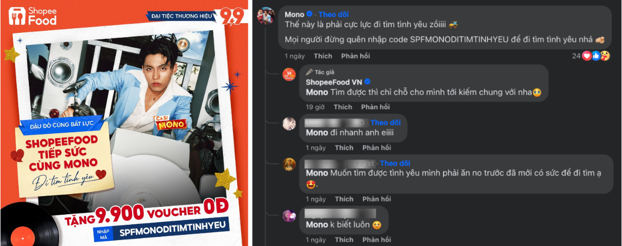 Thấy Mono và các fans vất vả, phải “phóng công nông” đi tìm tình yêu, ShopeeFood đã hoá “tổng tài" hào phóng tung cấp tốc 9.900 Deal Đi Tìm Tình Yêu để tiếp sức các fans ghi điểm khi gọi món cùng crush. Từ cà phê, trà sữa ngọt ngào, đến pizza phô mai béo ngậy, gà rán giòn rụm, tất tần tật đều “xếp hàng điểm danh" tại sự kiện ShopeeFood 9.9!