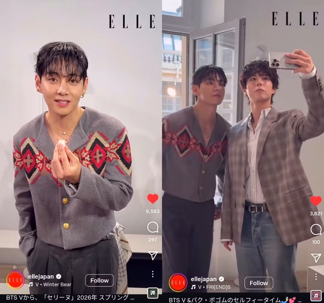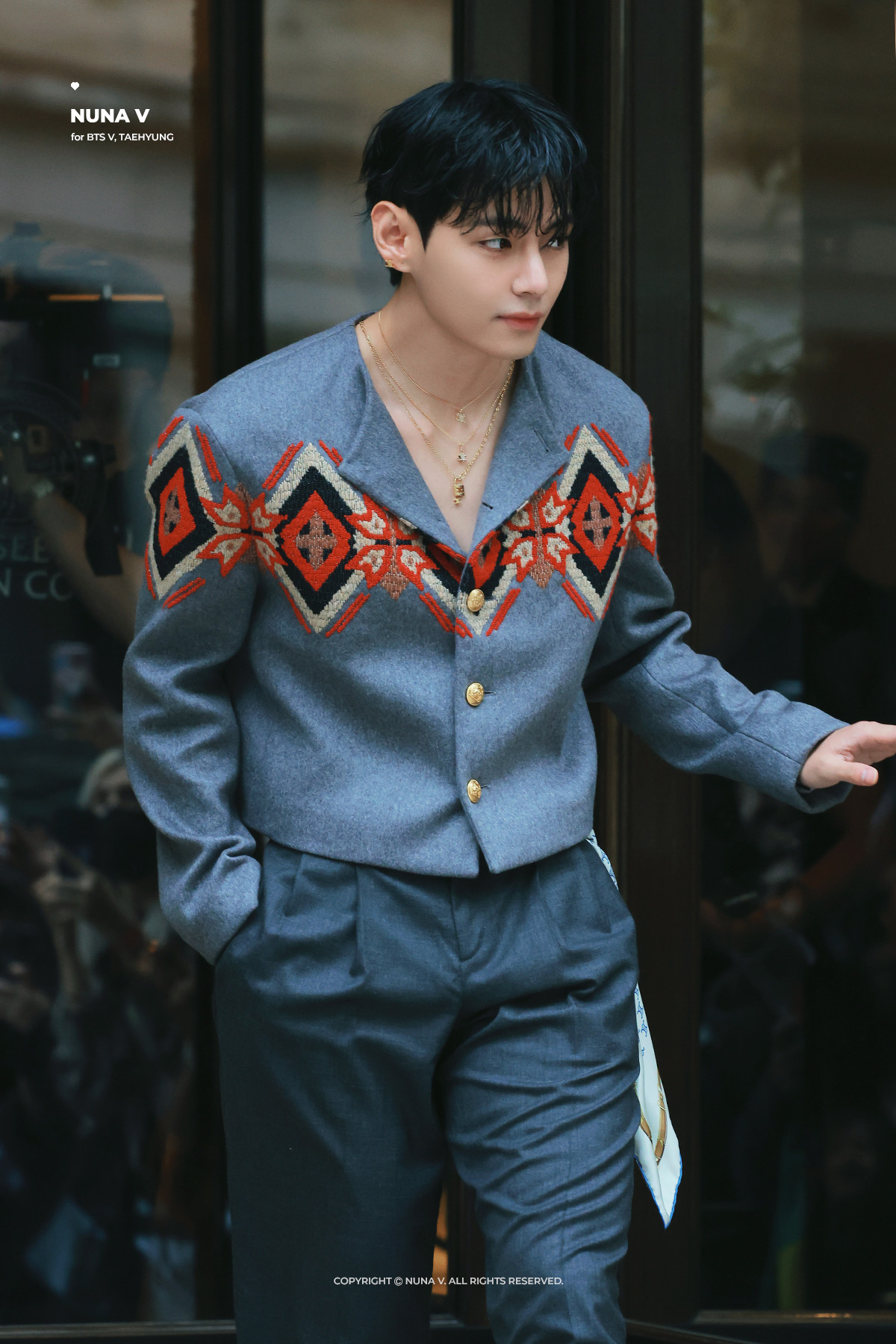 Sau khi xuất ngũ, V BTS tái xuất đầy ấn tượng, thu hút sự chú ý lớn từ truyền thông. Ngôi sao sinh năm 1995 có tạo hình bảnh bao tới dự sự kiện. Anh mặc áo cardigan xám họa tiết lạ mắt và quần âu cùng màu, hoàn thiện tạo hình với kiểu tóc vuốt ướt, đeo trang sức sợi mảnh tông vàng gold.