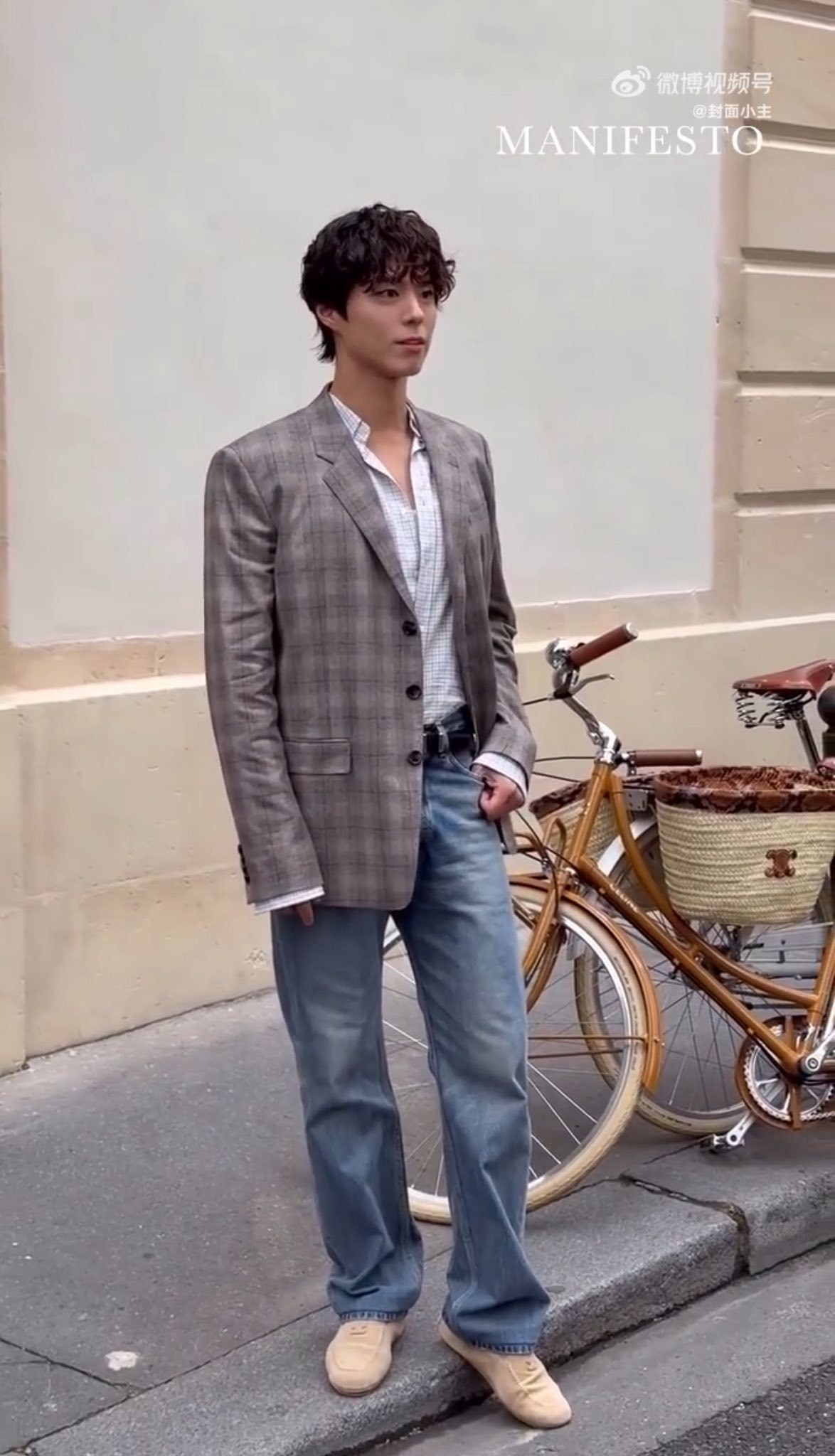 Park Bo Gum rạng rỡ tại sự kiện của nhà mốt Celine, diện trang phục lịch lãm. Bộ cánh gồm sơ mi kẻ, áo blazer tối màu kết hợp cùng quần jeans sáng màu, giày be mang tới tinh thần trẻ trung, tươi mới.