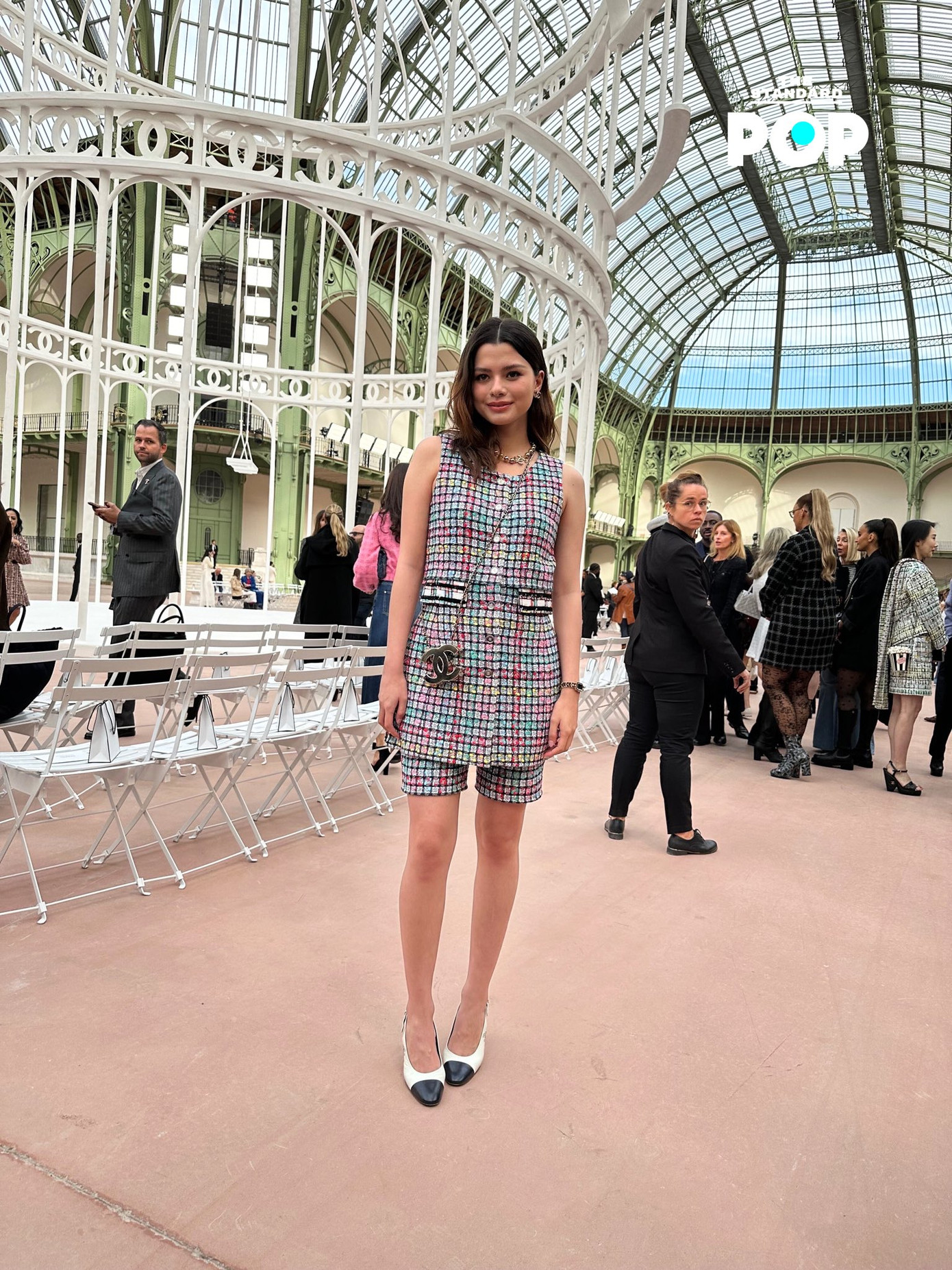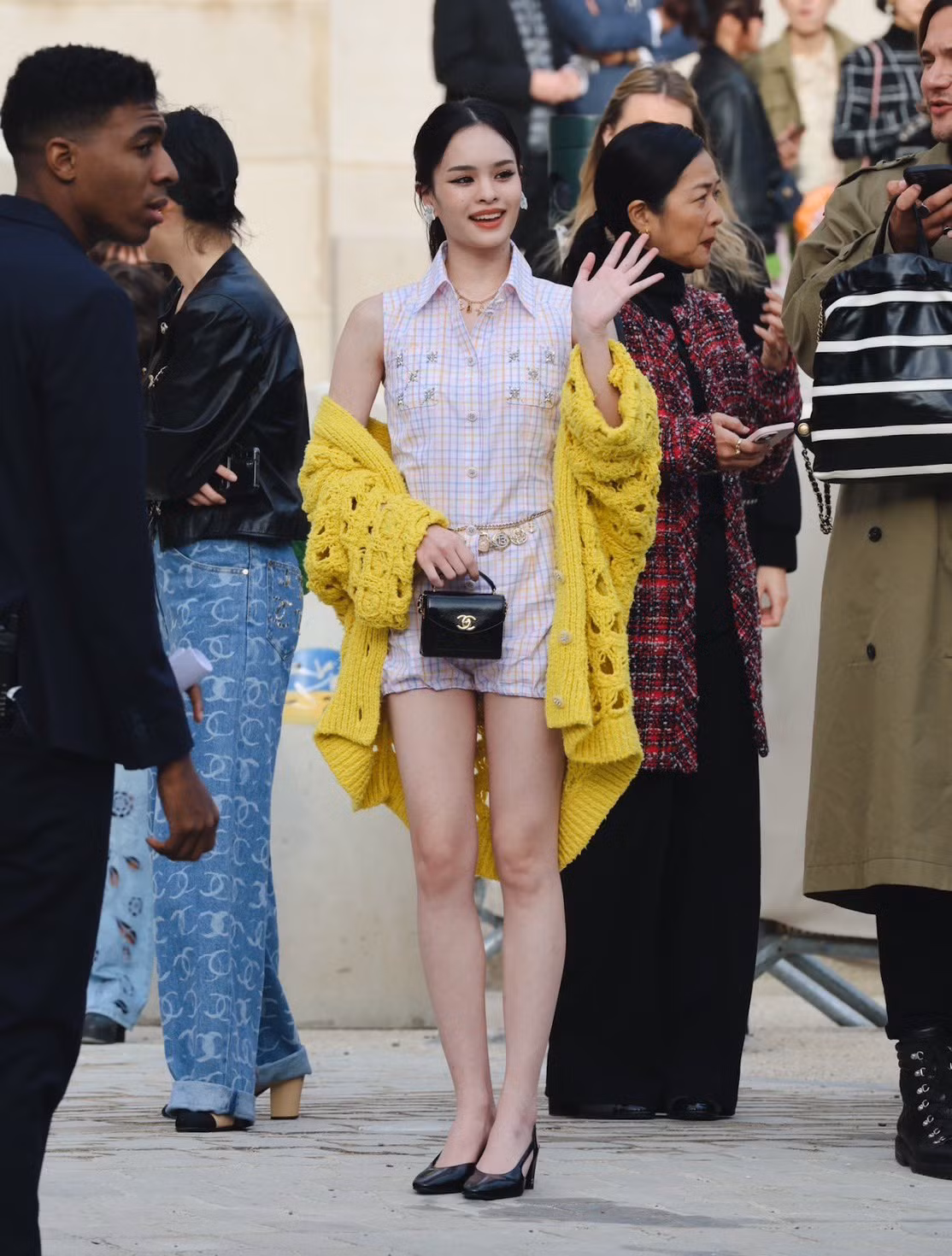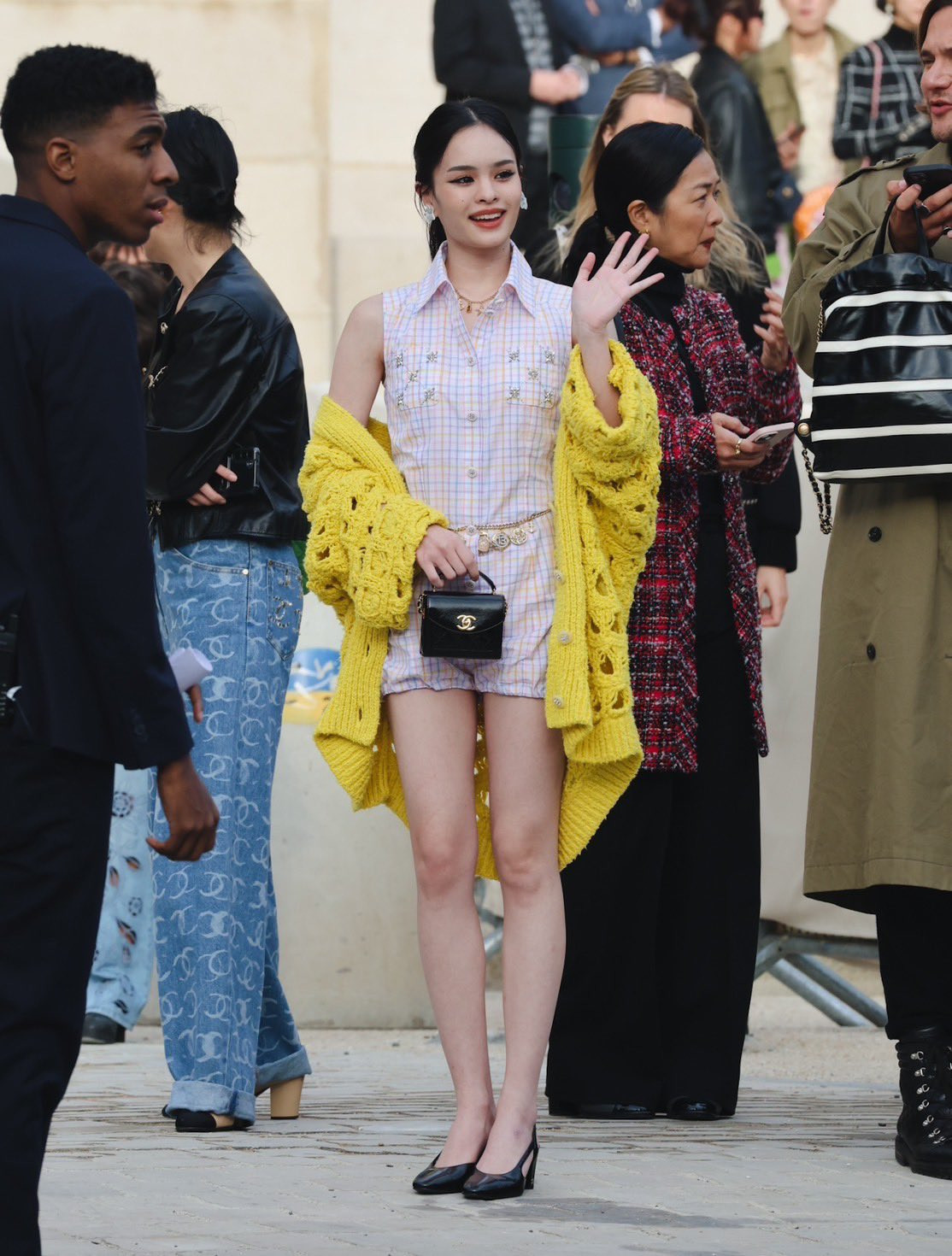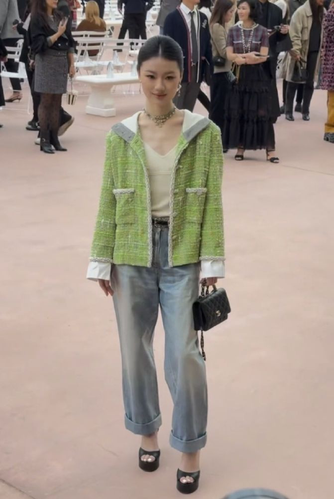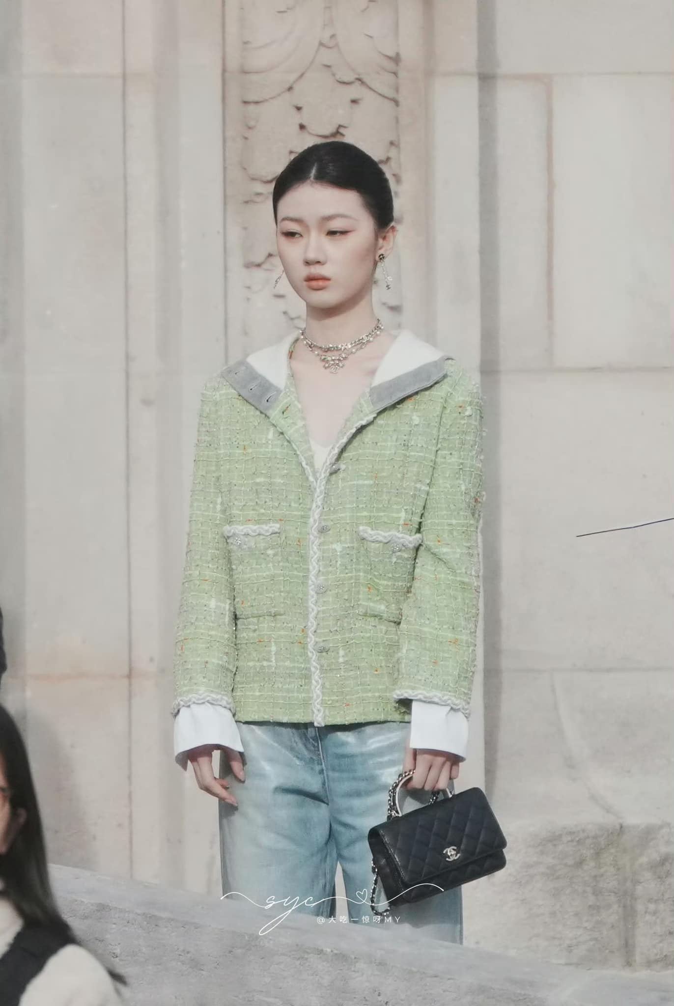Ca sĩ Thiện Y Thuần là khách mời người Trung Quốc tại show diễn ra mắt BST Xuân Hè 2025 của nhà mốt Chanel. Nữ nghệ sỹ sở hữu 9,5 triệu người hâm mộ trên Weibo có bản phối trẻ trung khi tham dự sự kiện. Cô mặc mẫu áo dạ tweed tông màu xanh lá cùng quần jeans ống suông.