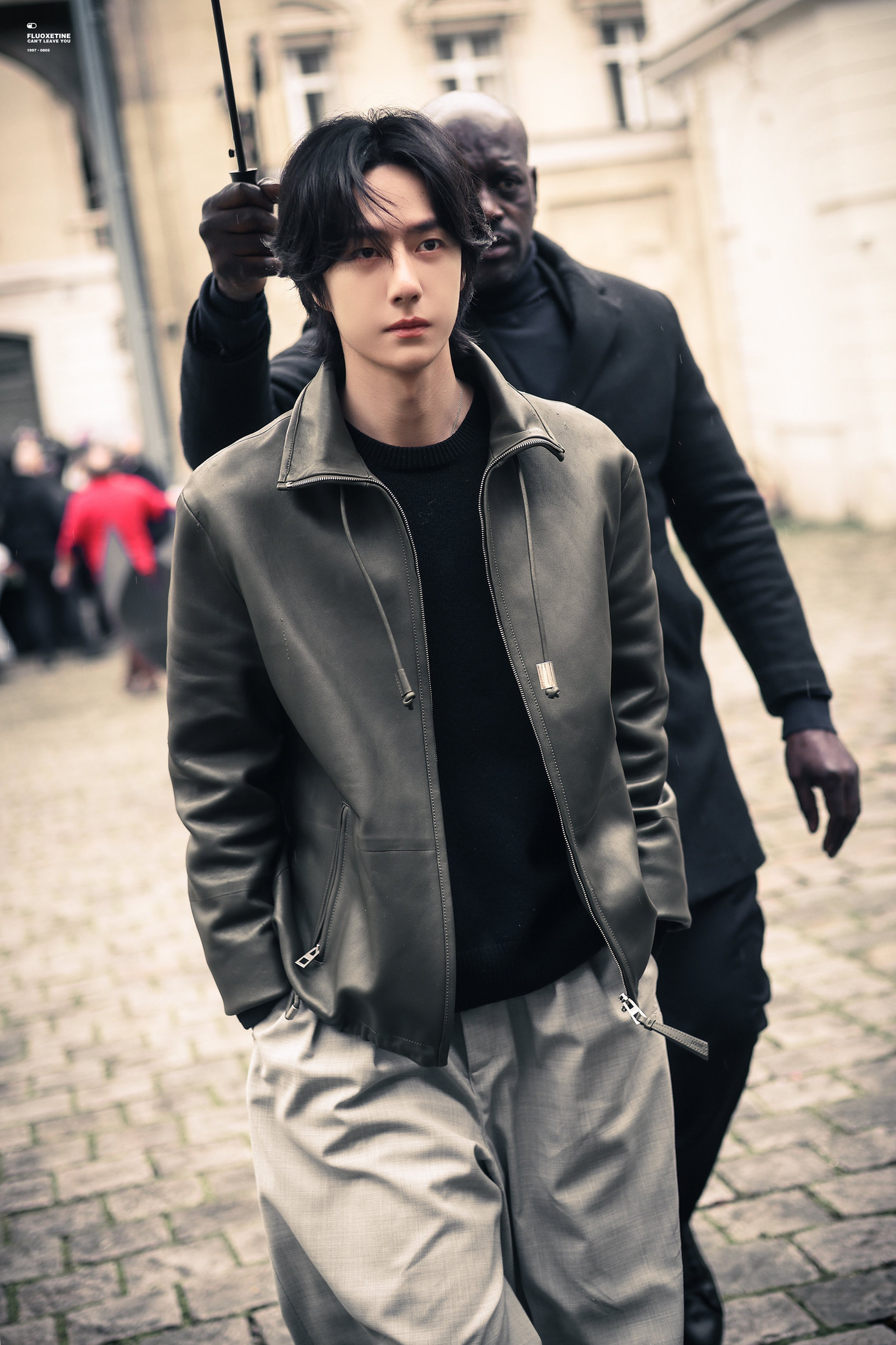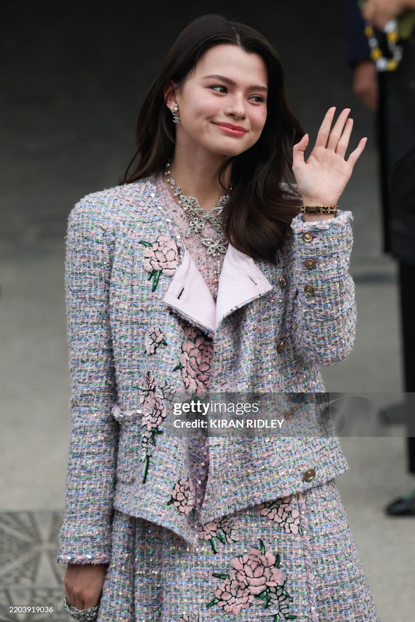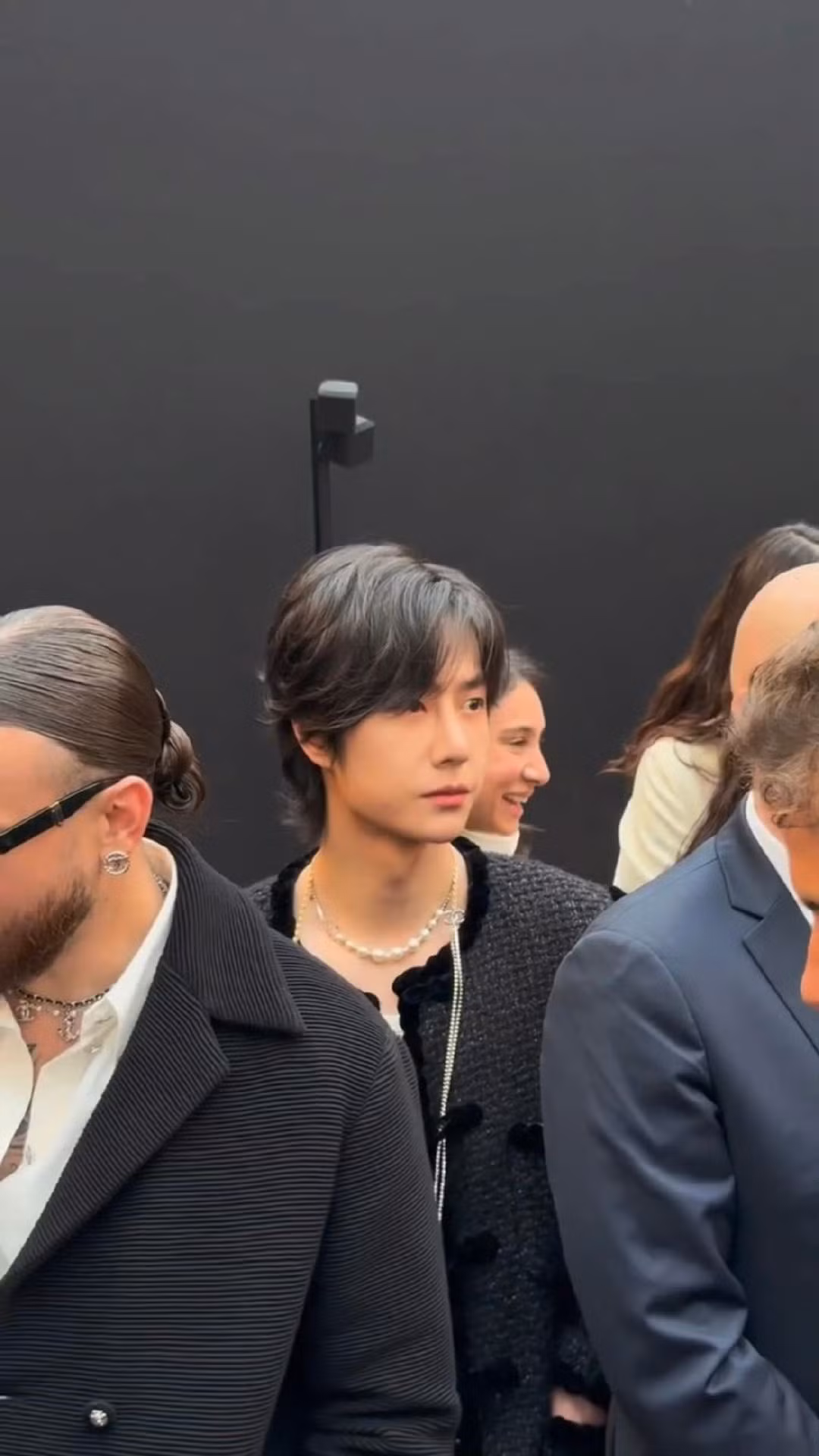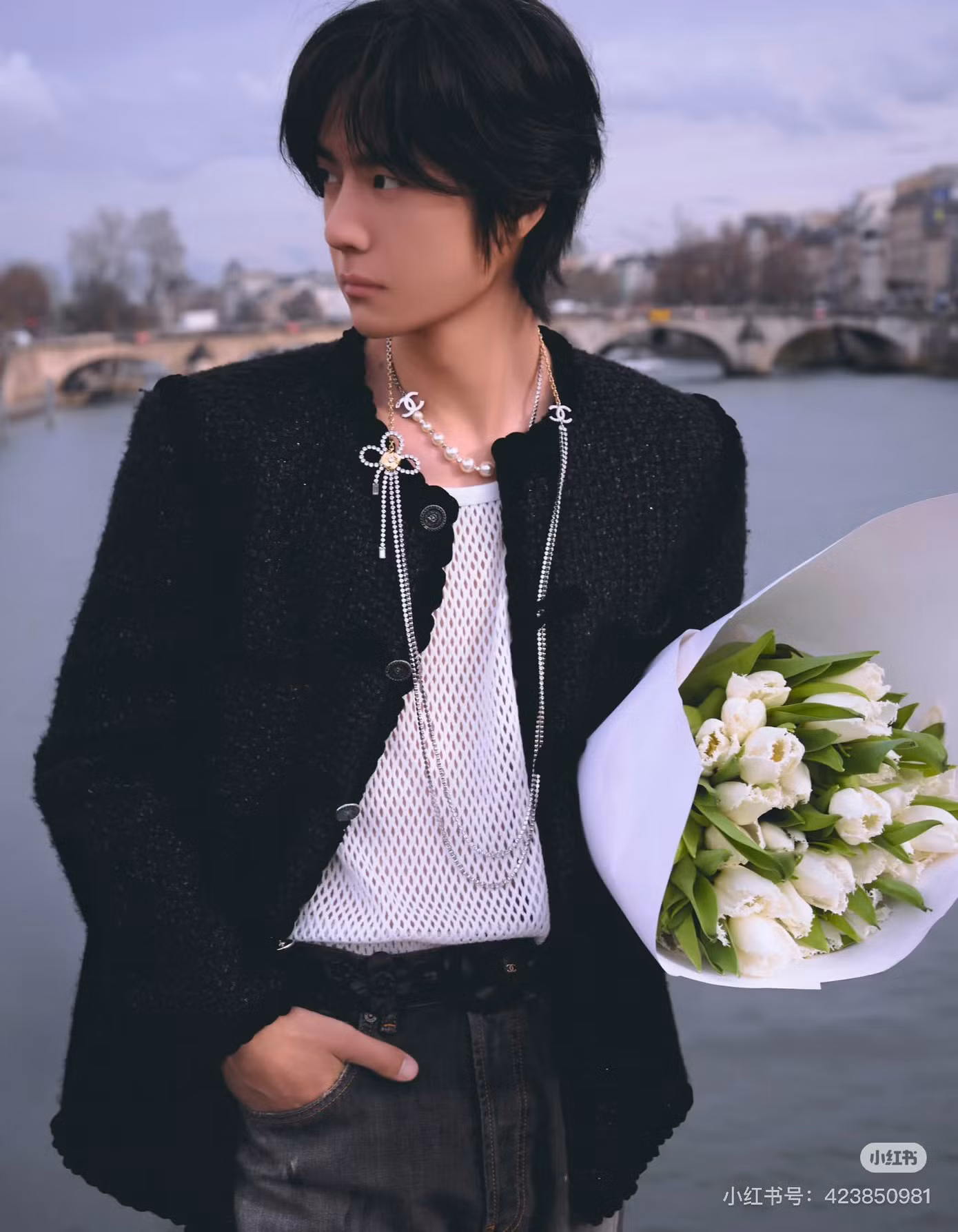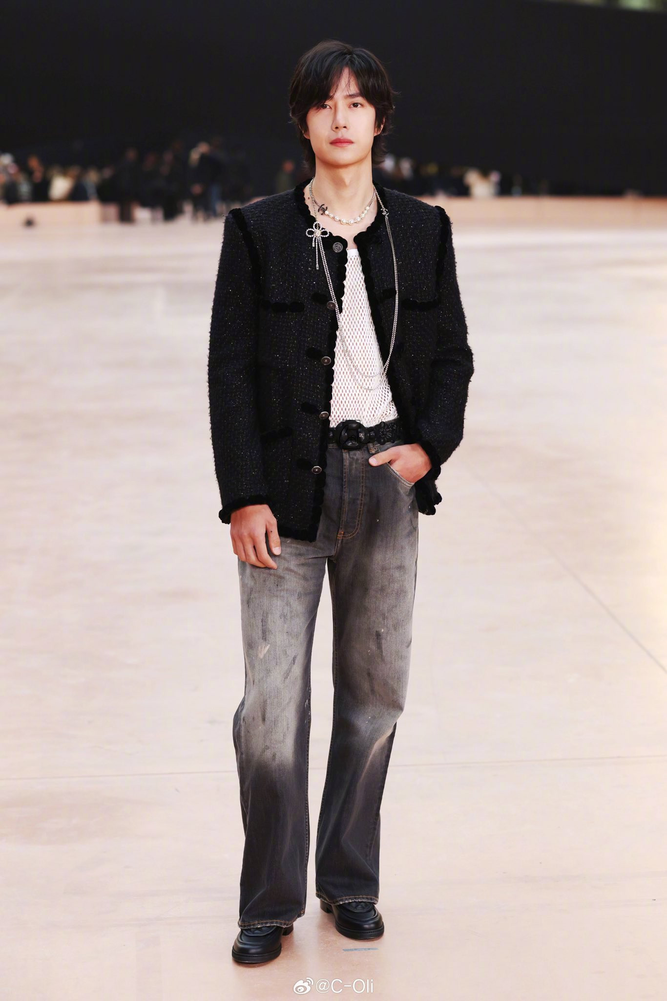 Vương Nhất Bác diện thiết kế áo khoác dạ tweed đến từ BST Métiers d’Art 2025 được ra mắt tại Hàng Châu năm ngoái. Anh hoàn thiện tạo hình với áo lưới, quần jeans và trang sức ngọc trai.