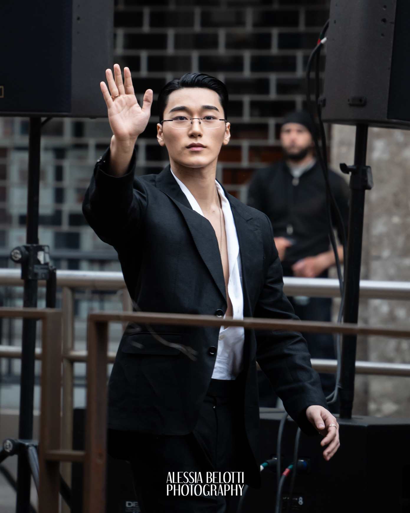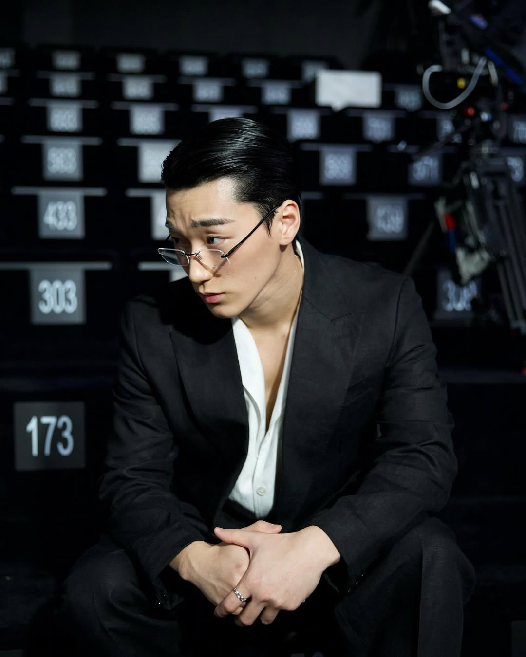 Choi San ATEEZ dự show với tạo hình nam tính, lịch lãm. Mỹ nam mặc âu phục tông màu tối, phối cùng áo sơ mi xẻ sâu. Kiểu tóc vuốt ngược, mẫu kính không gọng hoàn thiện vẻ ngoài bad boy của nam idol.
