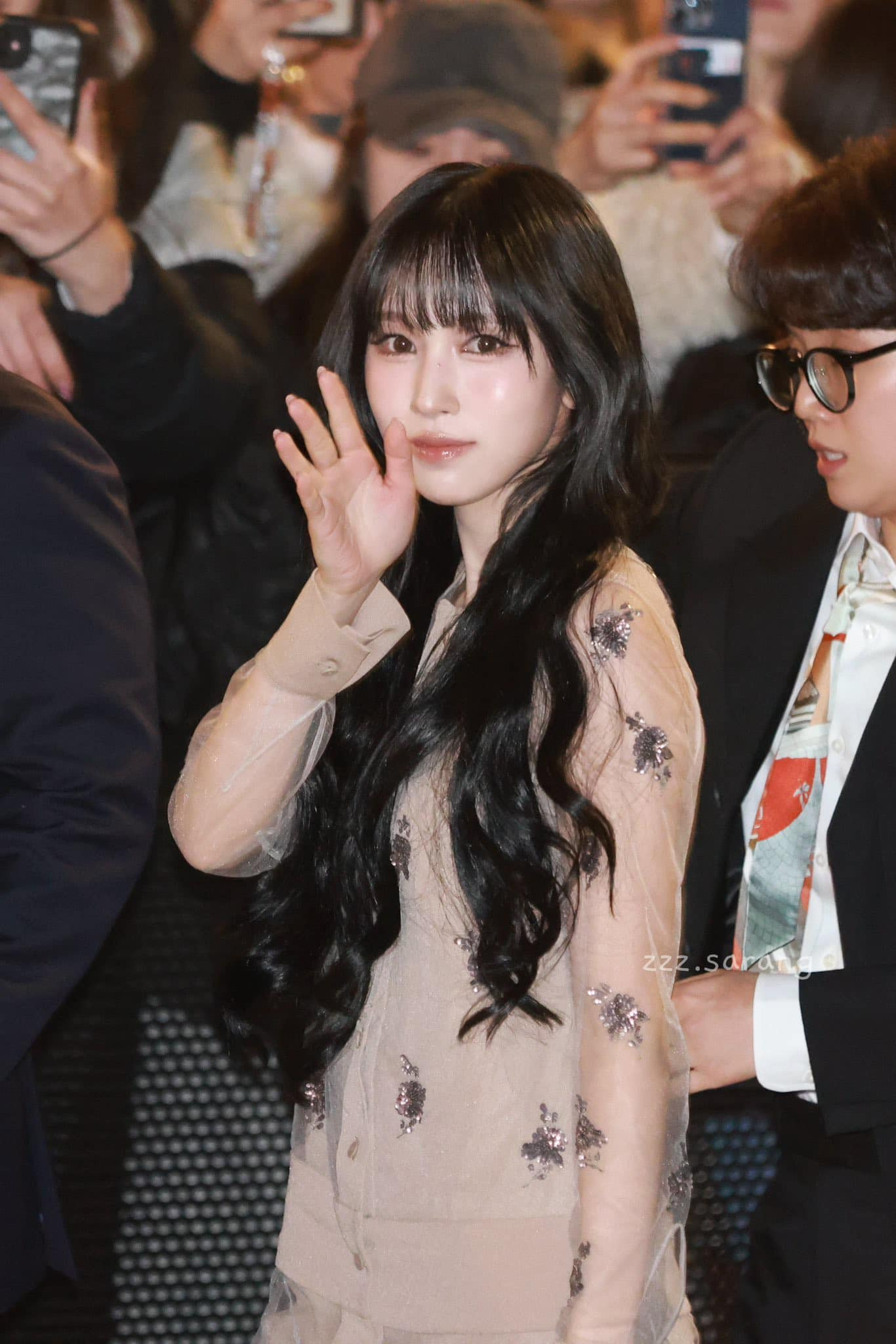 Tân đại sứ toàn cầu Mina TWICE có diện mạo nữ tính, cuốn hút khi tham dự show diễn ra mắt BST Thu Đông 2025 dành cho nữ. Nữ idol mặc trang phục tông nâu nhạt, gây thương nhớ nhờ kiểu tóc xoăn sóng nhẹ, trang điểm tông hồng.