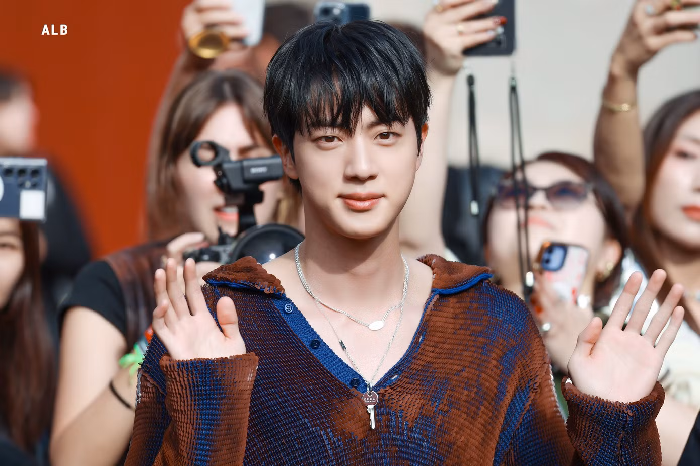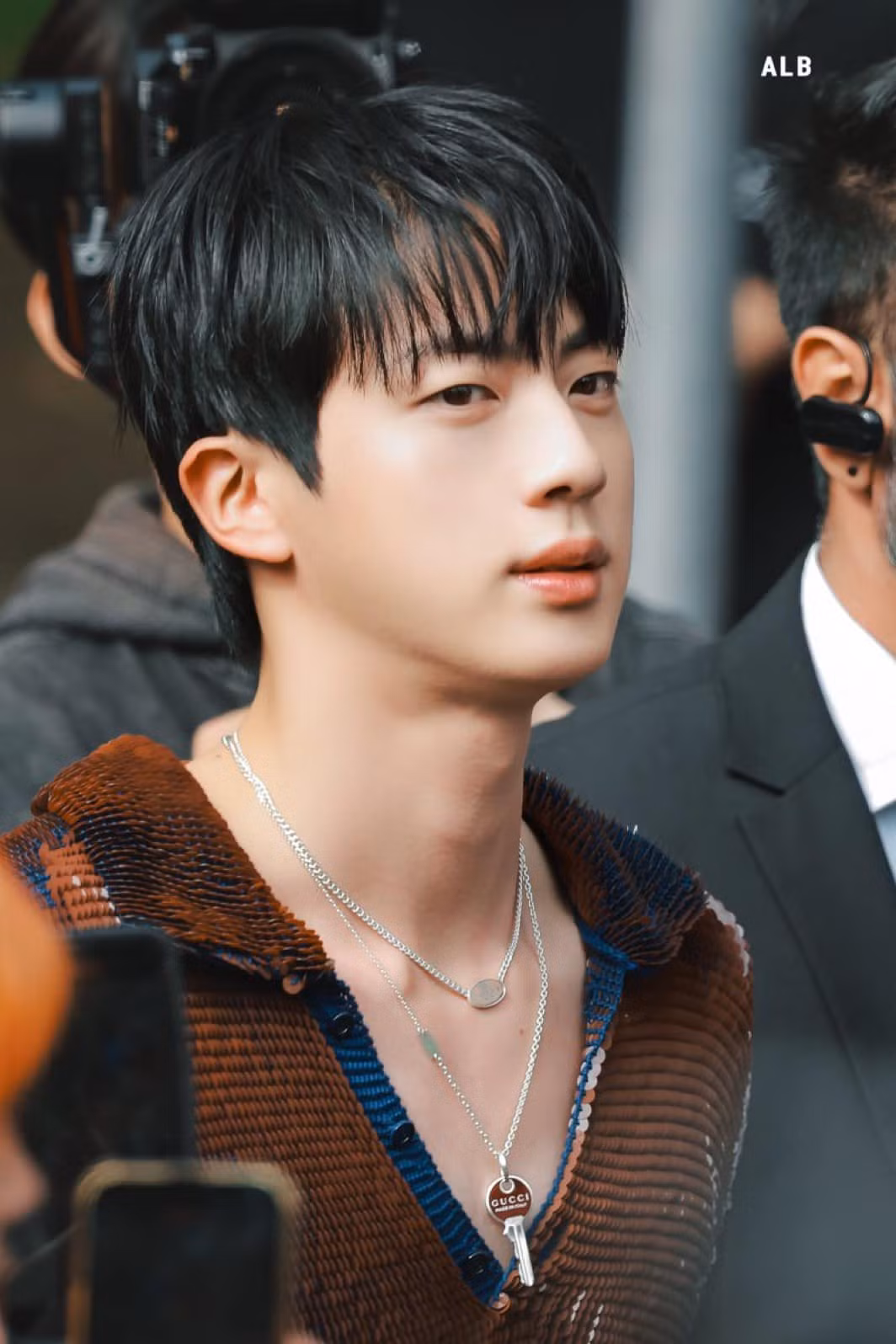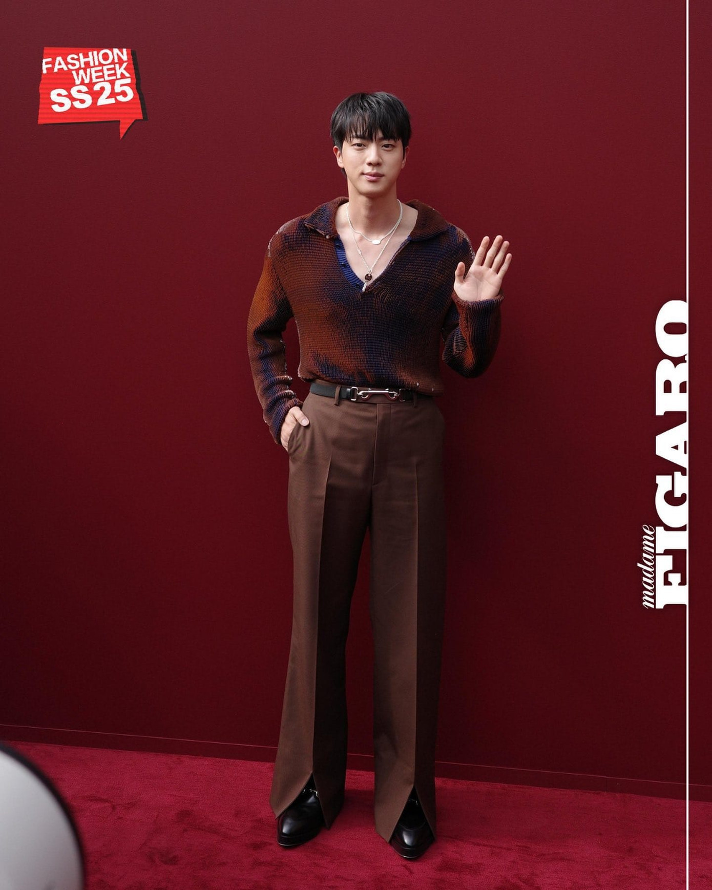 Trong tuần lễ thời trang đầu tiên kể từ khi xuất ngũ, Jin BTS xuất hiện với diện mạo bảnh bao, thời thượng. Nam idol 31 tuổi mặc trang phục tông nâu đất đến từ BST Xuân Hè mới nhất của Gucci kết hợp với trang sức tông màu bạc và giày loafer da bóng.