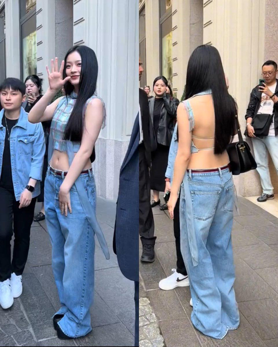 Tại show diễn của nhà mốt Ý, Hanni NewJeans nổi bật trong trang phục tông màu xanh pastel. Nữ đại sứ sinh năm 2004 phối quần jeans với mẫu áo tua rua lạ mắt và một chiếc khăn mảnh. Đáng chú ý, chiếc áo crop-top có thiết kế giúp nữ idol khoe lưng trần không tỳ vết.