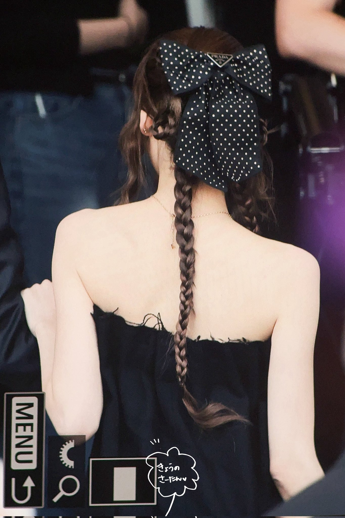Sana TWICE được mong đợi trong lần thứ 5 tham dự Milan Fashion Week 2025, xuất hiện trong tạo hình nguyên cây đen từ đầm cho tới túi xách, giày cao gót. Điểm sáng đến từ mái tóc tết cách điệu cài nơ chấm bi - họa tiết trendy của mùa mốt năm nay.