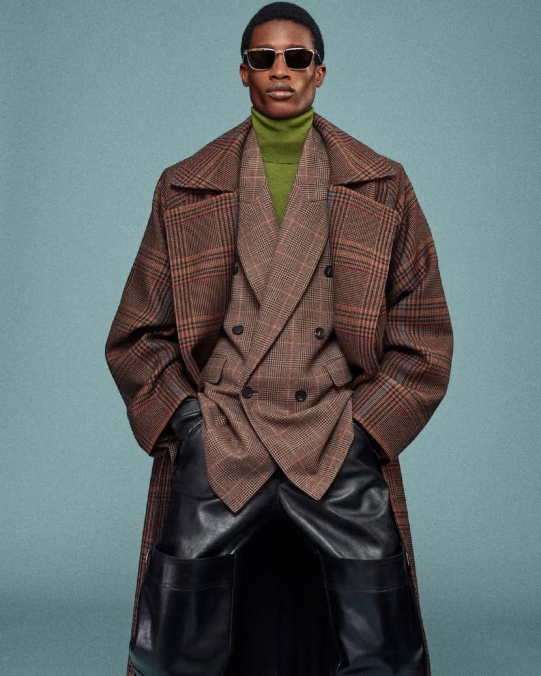 Nam thần xứ Hàn "lột xác" nhờ bộ cánh gồm quần da liền bốt, áo cao cổ xanh lá, blazer nâu họa tiết kẻ sọc. Các thiết kế nằm trong BST Thu Đông mới nhất dành cho nam của hãng.