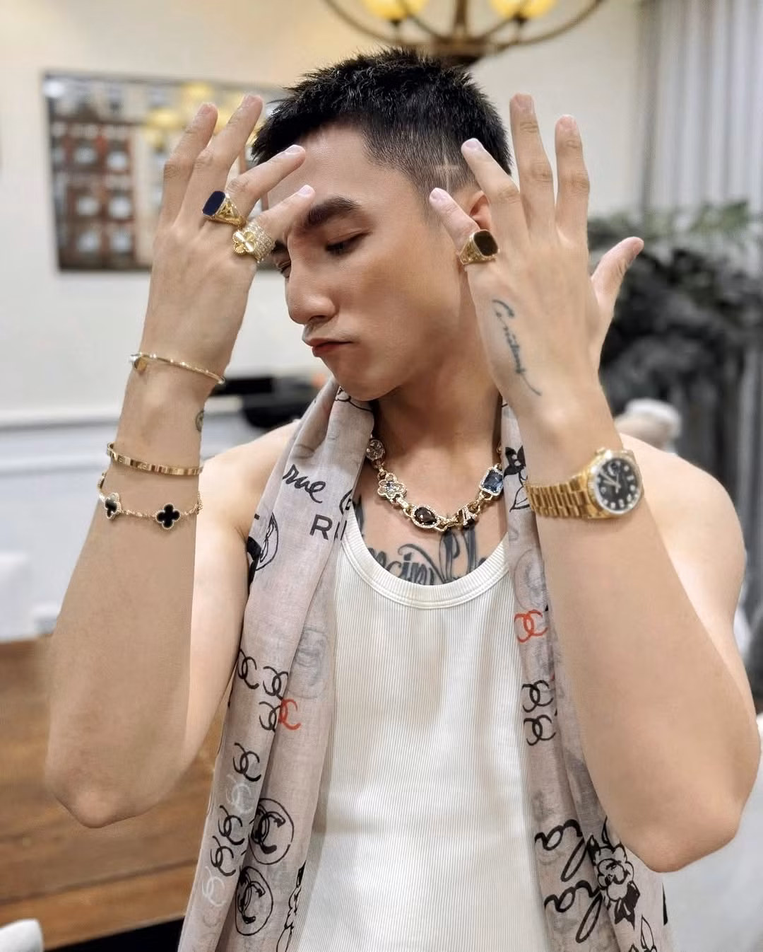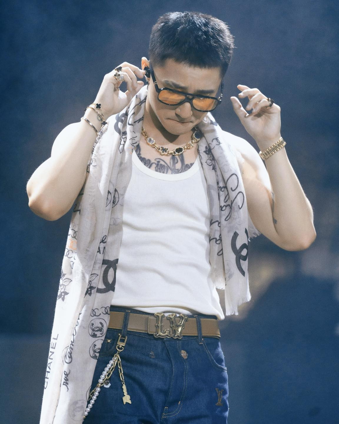 Trong một tấm hình được đăng tải trên Instagram cá nhân, Sơn Tùng M-TP flex loạt phụ kiện tông vàng gold, "hợp rơ" với họa tiết vải thêu trên trang phục.
