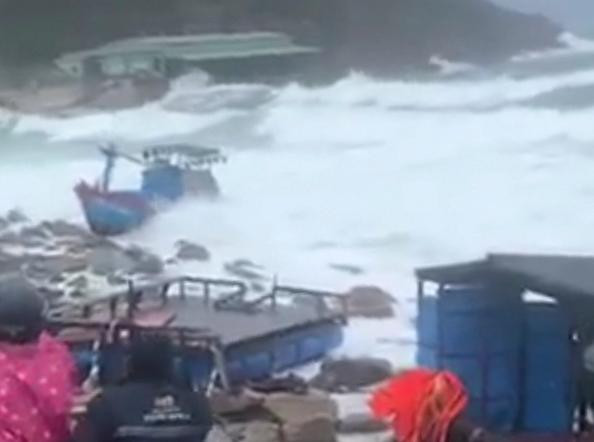 | Tàu ngư dân Phú Yên bị sóng lớn đánh dạt vào bờ. Ảnh: H.T |