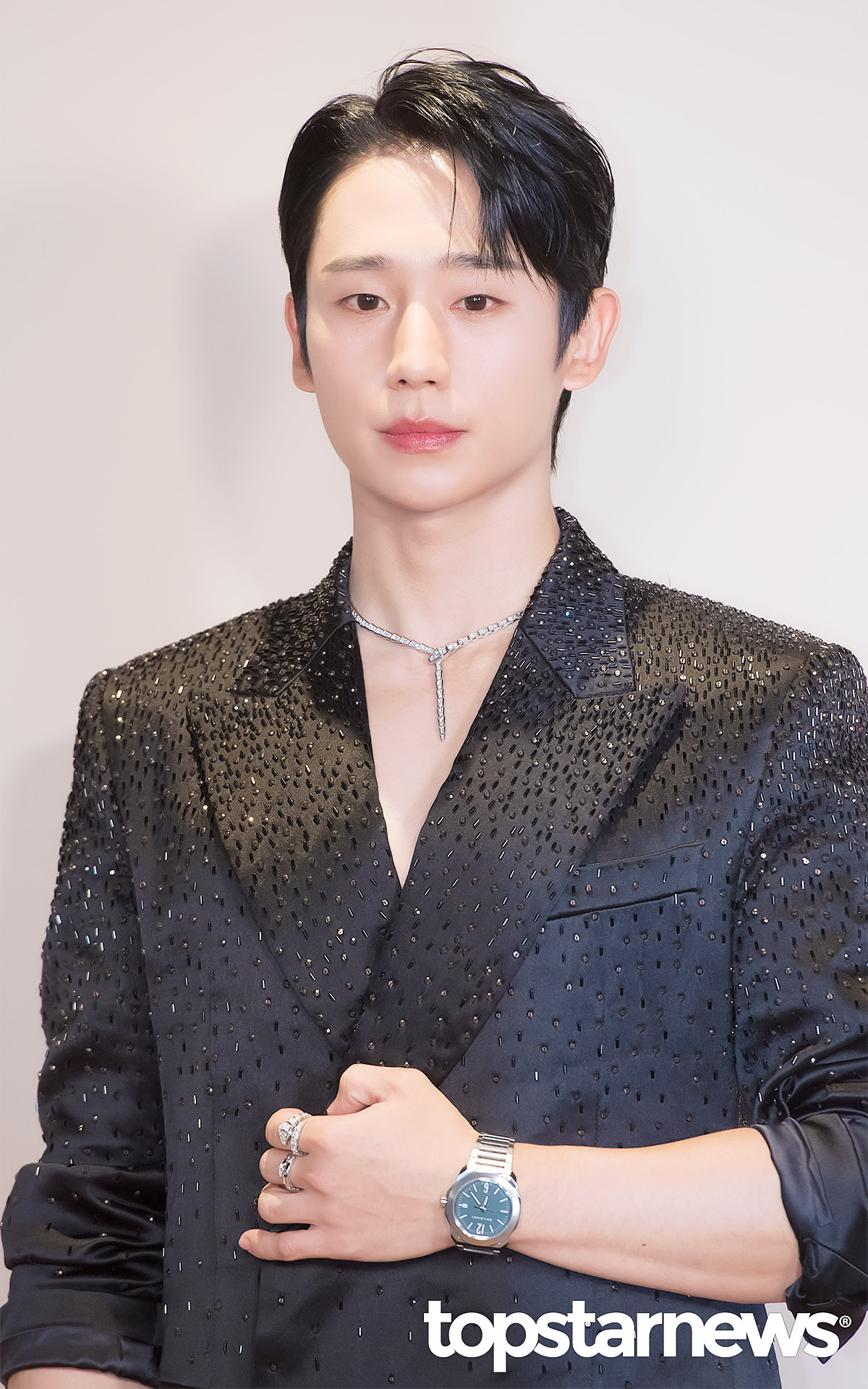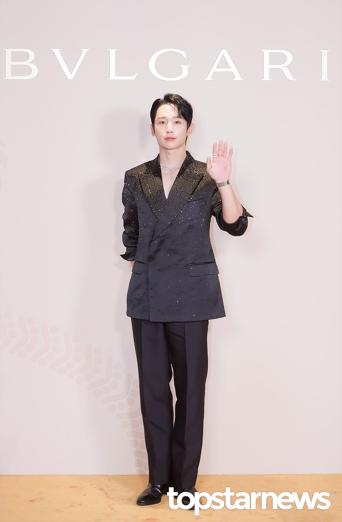 Jung Hae In bảnh bao tại lễ khai mạc triển lãm Serpenti Infinito của BVLGARI. Sao nam Love Next Door diện âu phục đính kết cườm phối cùng phụ kiện tông bạc.