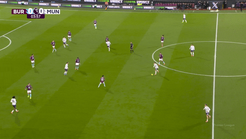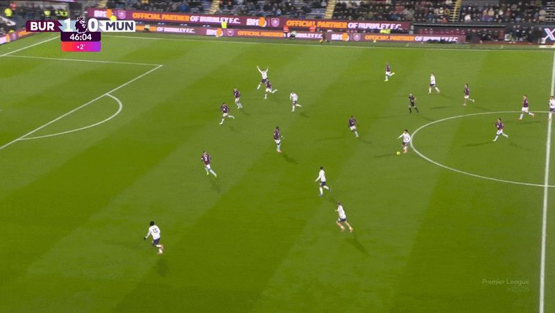 Hãy xem ba tình huống từ hiệp một trận hòa 2-2 trước Burnley hồi tháng Giêng - trận đấu đầu tiên của họ sau khi Amorim ra đi - nơi anh ấy chuyền bóng cho tiền vệ cánh trái Patrick Dorgu. Tình huống đầu tiên diễn ra ở phút thứ tư.