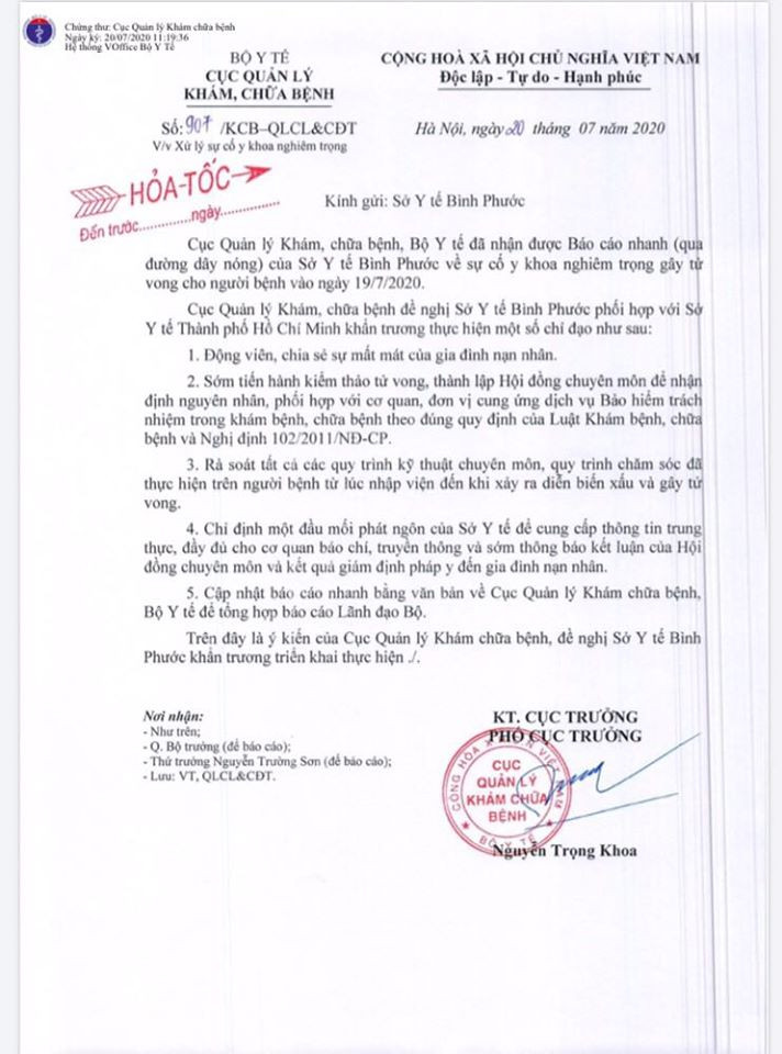 Sở Y tế Bình Phước cũng được yêu cầu cập nhật báo cáo nhanh bằng văn bản về Cục Quản lý Khám chữa bệnh, Bộ Y tế để tổng hợp báo cáo.
