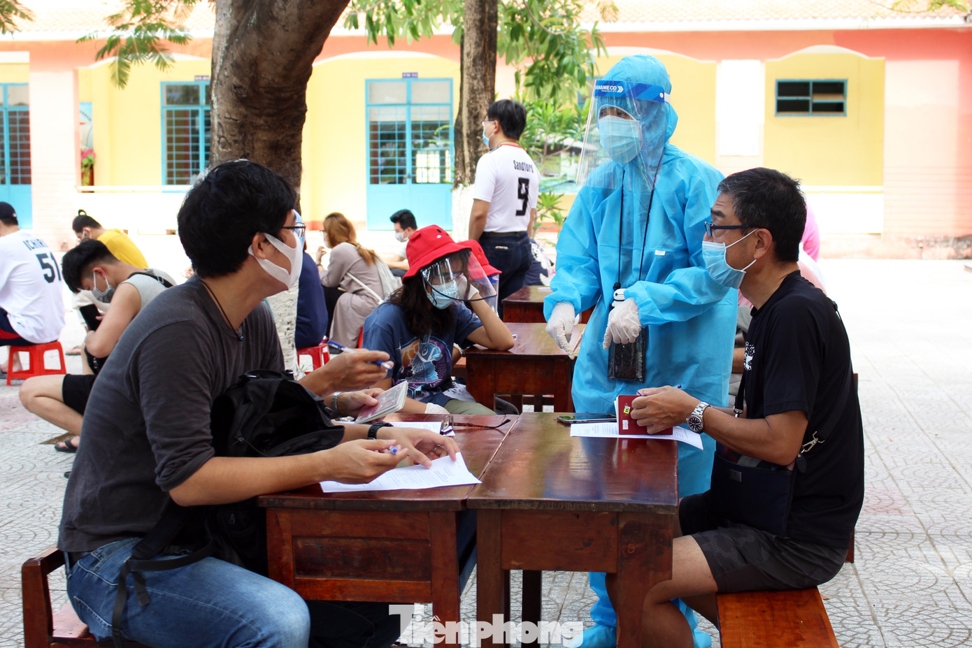Đúng 14h, nhiều người nước ngoài đã có mặt tại địa điểm này để chờ lấy mẫu xét nghiệm. Những người đến xét nghiệm sẽ nhận mẫu phiếu đăng ký và điền đầy đủ thông tin theo hộ chiếu rồi chờ đợi được gọi tên xét nghiệm. Ảnh: Giang Thanh