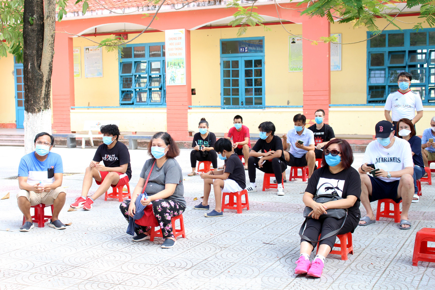 Tất cả những người nước ngoài tham gia xét nghiệm đều rất hợp tác với các nhân viên y tế, đeo khẩu trang liên tục và giữ khoảng cách trong khi chờ đợi đến lượt mình xét nghiệm. Ảnh: Giang Thanh