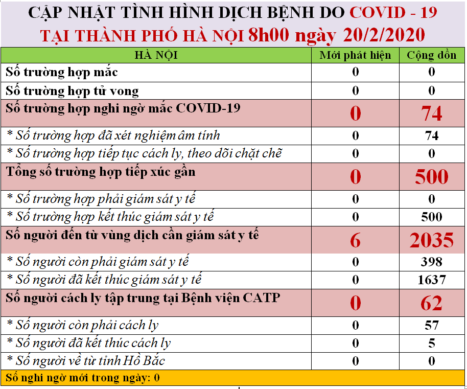 Theo đó, tổng số người đến từ vùng dịch Covid-19 phải giám sát y tế cộng dồn đến thời điểm này là 2035 trường hợp, trong đó 1637 trường hợp đã kết thúc giám sát y tế, còn 398 trường hợp vẫn đang phải thực hiện việc giám sát y tế và phát hiện 6 người mới đến từ vùng dịch phải giám sát y tế.