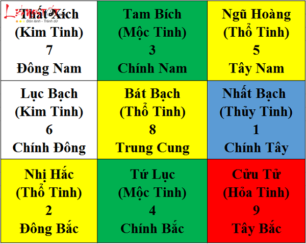 Sơ đồ hướng tỏa của 9 ngôi sao trong năm 2019. Trong đó, sao Bát bạch, ngôi sao chủ quản về tài lộc và may mắn sẽ tỏa tại trung cung, hay điểm chính giữa của ngôi nhà.