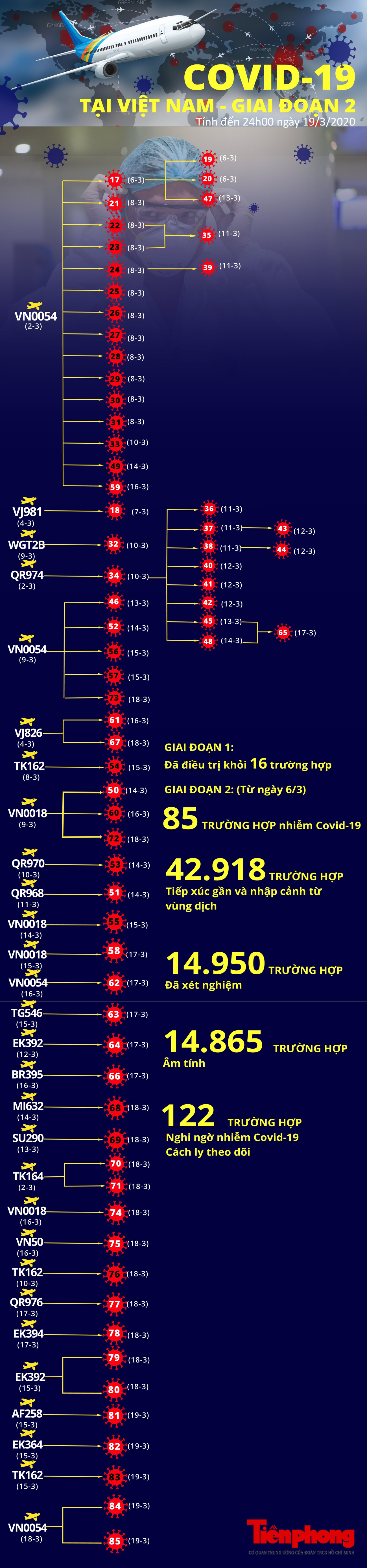 TPO - Tính đến 24h ngày 19/3, Việt Nam đã có 85 ca bệnh Covid-19 (16 trường hợp đã chữa khỏi). Điều đáng nói, trong số 69 ca mới ghi nhận có 53 trường hợp (người Việt Nam và người nước ngoài) về Việt Nam từ vùng dịch nước ngoài bằng các chuyến bay.