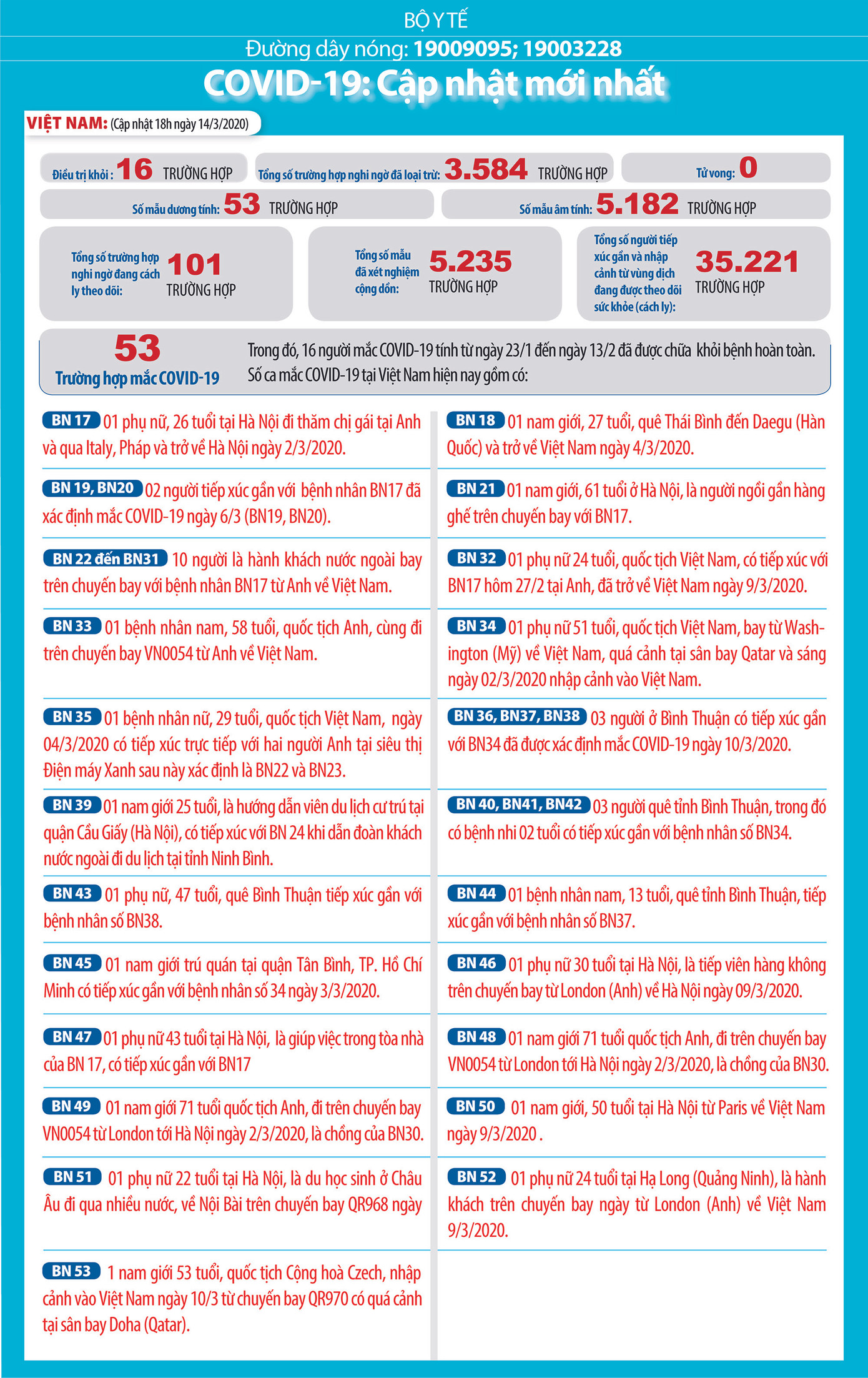 - 01 phụ nữ 22 tuổi tại Hà Nội, là du học sinh ở Châu Âu đi qua nhiều nước, về Nội Bài trên chuyến bay QR968 ngày 11/3/2020 (BN51).