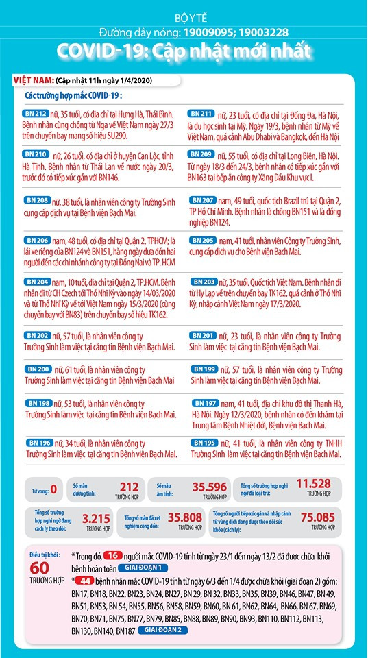 Theo đó, báo cáo mới nhất cập nhật lúc 11 giờ ngày 1/4 của Bộ Y tế cho thấy, hiện Việt Nam ghi nhận 212 người mắc COVID-19. Có 3.215 ca nghi ngờ mắc COVID-19, hơn 75.000 người đang theo dõi y tế.
