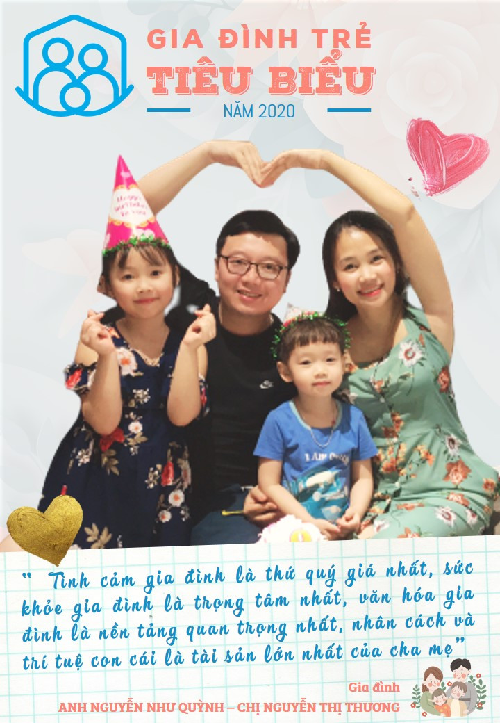 SVO - "Tình cảm gia đình là thứ quý giá nhất, sức khỏe gia đình là trọng tâm nhất, văn hóa gia đình là nền tảng quan trọng nhất, nhân cách và trí tuệ con cái là tài sản lớn nhất của cha mẹ". Đó là chia sẻ của gia đình anh Nguyễn Như Quỳnh và chị Nguyễn Thị Thương (tỉnh Hòa Bình), một trong 22 gia đình trẻ được tuyên dương "Gia đình trẻ tiêu biểu năm 2020".